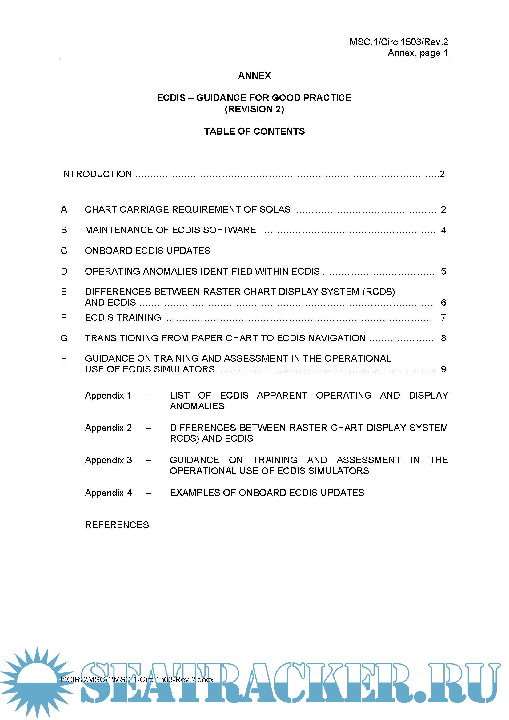 Description: IMO MSC.1-Circ.1503-Rev.2 ECDIS Guidance for Good Practice. The consolidated guidance termed "ECDIS - Guidance for Good Practice" is set out in the annex to this circular. Ship operators, masters and deck officers on ECDIS-fitted ships are encouraged to use this Guidance to improve their understanding and facilitate safe and effective use of ECDIS.