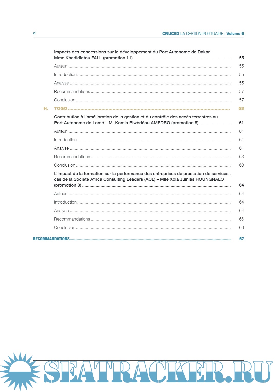 Description: Cette publication a été produite dans le cadre des activités du Programme de Gestion Portuaire TrainForTrade de la CNUCED. Elle a été financée par les ports du Bénin, Cameroun, Côte d’ivoire, Gabon, Guinée, Haïti, Sénégal et Togo. Ce projet a aussi reçu le soutien des grands ports maritimes de Nantes Saint-Nazaire et de Marseille- Fos (France). Les résumés des études de cas soumis par les participants de la formation composant cette publication ont été préparés par Elodie Bardin et Carine Fabre de l'institut de formation du Port de Marseille-Fos, Dominique Chantrel et Guillaume Marneffe, membres du personnel de la CNUCED, le tout encadré par Mark Assaf, Chef de la Section du développement des ressources humaines/TrainForTrade, sous la supervision de Geneviève Féraud, Chef du Service du développement des connaissances, et Shamika N. Sirimanne, Directeur de la Division des Transports et de la Logistique. Dans la présente publication, les termes pays/économie désignent, selon le cas, des territoires ou des zones. Les appellations employées et la présentation des données n’impliquent de la part du Secrétariat de l’Organisation des Nations Unies aucune prise de position quant au statut juridique des pays, territoires, villes ou zones ou de leurs autorités, ni quant au tracé de leurs frontières ou limites. La mention d’une société et de ses activités ne doit pas être interprétée comme une marque de soutien de la part de la CNUCED à cette société ou à ses activités. Le texte de la présente publication peut être cité ou reproduit, sous réserve qu’il soit fait mention de la source et qu’un exemplaire de la publication où sera reproduit l’extrait cité soit communiqué au secrétariat de la CNUCED. Le présent document n’a pas fait l’objet d’une relecture par les services d’édition.