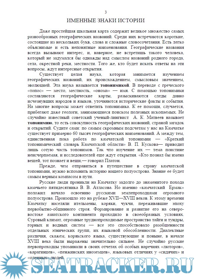 Описание: Почти тридцать лет минуло с той поры, когда вышла в свет книга «Слово на карте». Написал ее камчатский краевед В. И. Воскобойников, наблюдательный и пытливый человек, впервые попытавшийся заглянуть в тайны камчатской топонимии. Спустя пять лет был опубликован «Краткий топонимический словарь Камчатской области» В. П. Кускова. Обе работы давно уже стали библиографической редкостью. Между тем, интерес к географическим названиям Камчатки все возрастает, и его не могут удовлетворить немногие публикации, появляющиеся в различных, к тому же труднодоступных изданиях. В какой-то мере восполнить этот пробел поможет читателю предлагаемая книга. В ней рассказывается об истории географических названий и географических объектов полуострова Камчатка. Книга — своеобразное приложение к морским лоциям камчатских побережий, материалы расположены здесь в том же порядке. Вместе с тем эта работа адресована не только морякам, но и всем, кто интересуется топонимией полуострова, его историей. Как и любое справочное издание, книга рассчитана на выборочное чтение. Этим и объясняется необходимость повторения в отдельных очерках одних и тех же событий, имен, характеристик. Это первое издание подобного рода на Камчатке, и автор заранее благодарен читателям, которые помогут советами, дополнениями, уточнениями, необходимыми для дальнейшей работы.