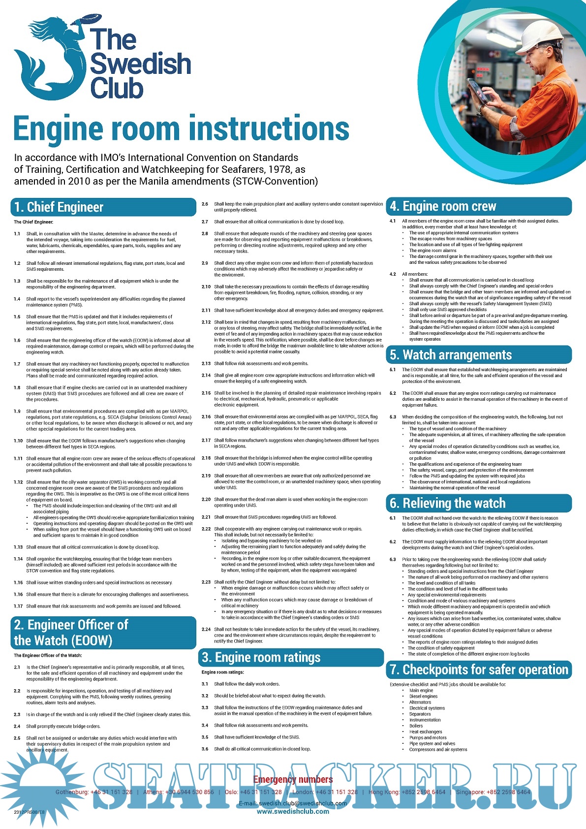 Description: The Engine room instructions are based in accordance with IMO’s International Convention on Standards of Training, Certification and Watchkeeping for Seafarers, 1978, as amended in 2010 as per the Manila amendments (STCW-Convention).