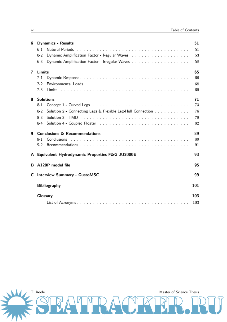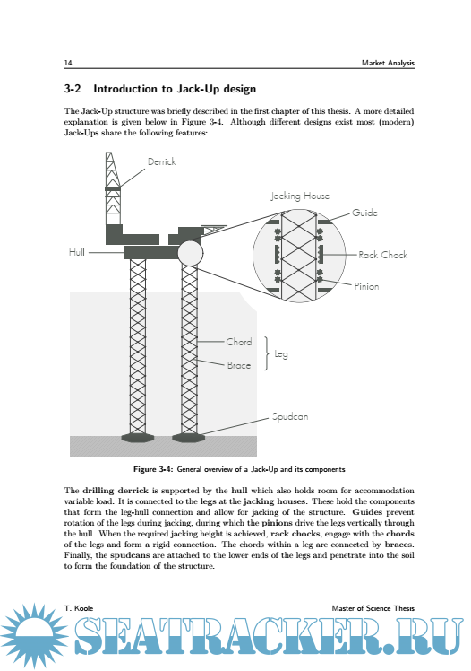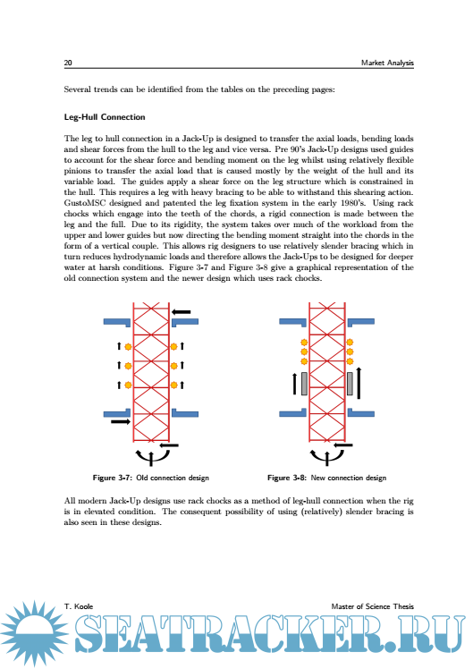 Year: 2015 Language: English Author: T. Koole Genre: Other Publisher: Delft University of Technology Format: PDF Quality: eBook Pages count: 116 Description: Jack-Ups have been used since 1954, and have become the most widely used Mobile Offshore Drilling Unit (MODU) for offshore exploration and development purposes that are carried out by oil companies such as Shell. They have been a subject of much research during the end of the 1980’s, but have seen limited publications since the change of the millennium. In the meantime, the industry has seen the introduction of a new breed of Jack-Up designs, capable of operating in water depths up to 170 meters in harsh environments such as The North Sea. In order to ensure safe operation of these newer Jack-Ups, a study is carried out to update Shell’s in-house knowledge. This allows the company to gain more insight into the various designs available and also helps to identify the governing design parameters within Jack-Up assessments. Furthermore, the future of Jack-Up designs is investigated as it will help Shell shape prospective offshore developments. A market analysis identifies the trends within Jack-Up designs which can be used to generate the models used in the main body of this research. Quasi-static environmental loads are analysed to investigate the effects of using Jack-Ups in greater water depths. The dynamic response is then added as Jack-Ups are known to show significant dynamic behaviour. Timedomain FEM is used as it allows for the incorporation of the non-linearities that are present in the system. The final chapters of this thesis focus on the future of Jack-Up design. Firstly, the limits of the current design philosophy are identified. Secondly, four possible solutions to overcome these boundaries are proposed and briefly analysed to evaluate their potential. This thesis has shown that modern Jack-Ups are characterised by large triangular hulls, holding three spacious truss legs. Rack-chocks form a very stiff leg-hull connection which has allowed designers to reduce brace diameters and increase chord spacing. This has lead to an increase in problems associated with Rack Phase Difference. Wind loads increase significantly with these modern rig designs but wave loads remain fairly unchanged due to increased leg spacing. Modern Jack-Ups therefore become more wind-dominated when compared to older designs. This stresses the need for accurate calculation of wind-loads during JackUp assessment. The dynamic response analysis and its non-linearities remain to play an important role in the assessment of the structure. Significant dynamic amplification of the oscillating wave loads is found. The future of the current Jack-Up design philosophy is limited to approximately 200 meters. As hull weights and water depths increase, a strong increase in leg stiffness is required to prevent resonance from occurring. Fabrication and operational limits prevent the stiffness from increasing further. Solutions to overcome these boundaries show the difficulties of designing hybrid structures like Jack-Ups; improvements made in one area will often lead to compromises being made in another.