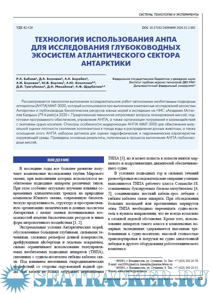 СОДЕРЖАНИЕ СИСТЕМЫ, ТЕХНОЛОГИИ И ЭКСПЕРИМЕНТЫ 4 Кебкал К.Г. Численное моделирование скрывающих свойств гидроакустических сигналов связи с линейной разверткой несущей 13 Бабаев Р.А., Боловин Д.А., Борейко А.А., Боровик А.И., Ваулин Ю.В., Коноплин А.Ю., Трегубенко Д.И., Михайлов Д.Н., Щербатюк А.Ф. Технология использования АНПА для исследования глубоководных экосистем Атлантического сектора Антарктики МОДЕЛИ, АЛГОРИТМЫ И ПРОГРАММНЫЕ СРЕДСТВА 22 Ваулин Ю.В., Дубровин Ф.С., Щербатюк А.Ф., Щербатюк Д.А. Разностно-дальномерная система навигации для обеспечения групповой работы морских робототехнических комплексов 34 Костенко В.В., Мокеева И.Г. Исследование характеристик установившихся режимов и динамики привязной системы автономного подводного робота с буксируемым поверхностным модулем радиосвязи СРЕДСТВА И МЕТОДЫ ПОДВОДНЫХ ИССЛЕДОВАНИЙ 42 Касаткин Б.А., Касаткин С.Б. Особености работы комбинированного приемника на борту подводного планера (глайдера) 49 Салюк П.А., Степочкин И.Е., Захарков С.П., Игнатьева Е.С., Яковлева Д.А., Шупило А.И., Качур В.А., Нагорный И.Г. Анализ применимости спутниковых данных по цвету моря в Амурском заливе в летний период 56 Пивоваров А.А., Самченко А.Н., Швырев А.Н., Ярощук И.О. Использование гидрофизического исследовательского комплекса в натурном эксперименте на шельфе Японского моря 62 Фищенко В.К., Зимин П.С., Голик А.В., Гончарова А.А. Использование систем стационарного подводного видеонаблюдения для оценивания параметров подводных течений и морского волнения 74 Рефераты