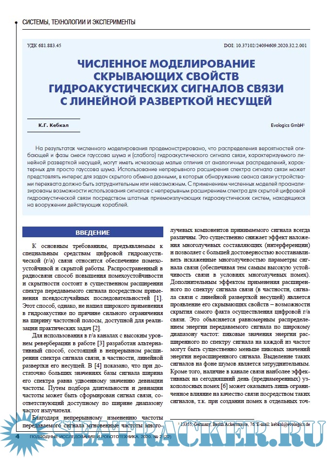 Описание: Научно-технический журнал «Подводные исследования и робототехника» посвящен проблемам исследования и освоения Мирового океана и относится к области знаний, лежащей на стыке наук:- теоретической и прикладной механики, навигации и управления движением, динамики управляемых систем и процессов,- робототехники, мехатроники, автоматизированного конструирования технических устройств, информатики и вычислительной техники,- теоретической и прикладной океанографии, физики океана, гидроакустики, морской геологии, экологии морских акваторий.Цель журнала – систематизировать и объективно отражать все наиболее значимые научно-технические и практические достижения и результаты исследований по освоению подводного пространства и морского дна, способствовать развитию новых идей, средств и методов подводных исследований и робототехники, консолидировать усилия научных и деловых кругов, потенциальных потребителей новейших достижений в сфере подводных технологий.Журнал «Подводные исследования и робототехника» публикует научно-технические статьи, проблемные, обзорные, дискуссионные материалы по всем направлениям, относящимся к методам и техническим средствам исследования и освоения океана, включая подводные аппараты и роботы, акустические, гидрологические, геофизические средства и методы исследования физических полей океана.Авторами публикаций журнала являются авторитетные ученые, ведущие специалисты и молодые исследователи из научных организаций и вузов Москвы и Подмосковья, Санкт-Петербурга, Зарубежья, Дальнего Востока, Урала, Сибири, и других регионов России. Для научного рецензирования и редактирования публикуемых статей привлекаются авторитетные специалисты в соответствующих областях знаний.Читательская аудитория - широкий круг ученых и специалистов, работающих в области исследования морских глубин, деловые круги и потенциальные потребители научно-технических разработок и инновационных проектов, молодые ученые, аспиранты и студенты, специализирующаяся в указанной области.