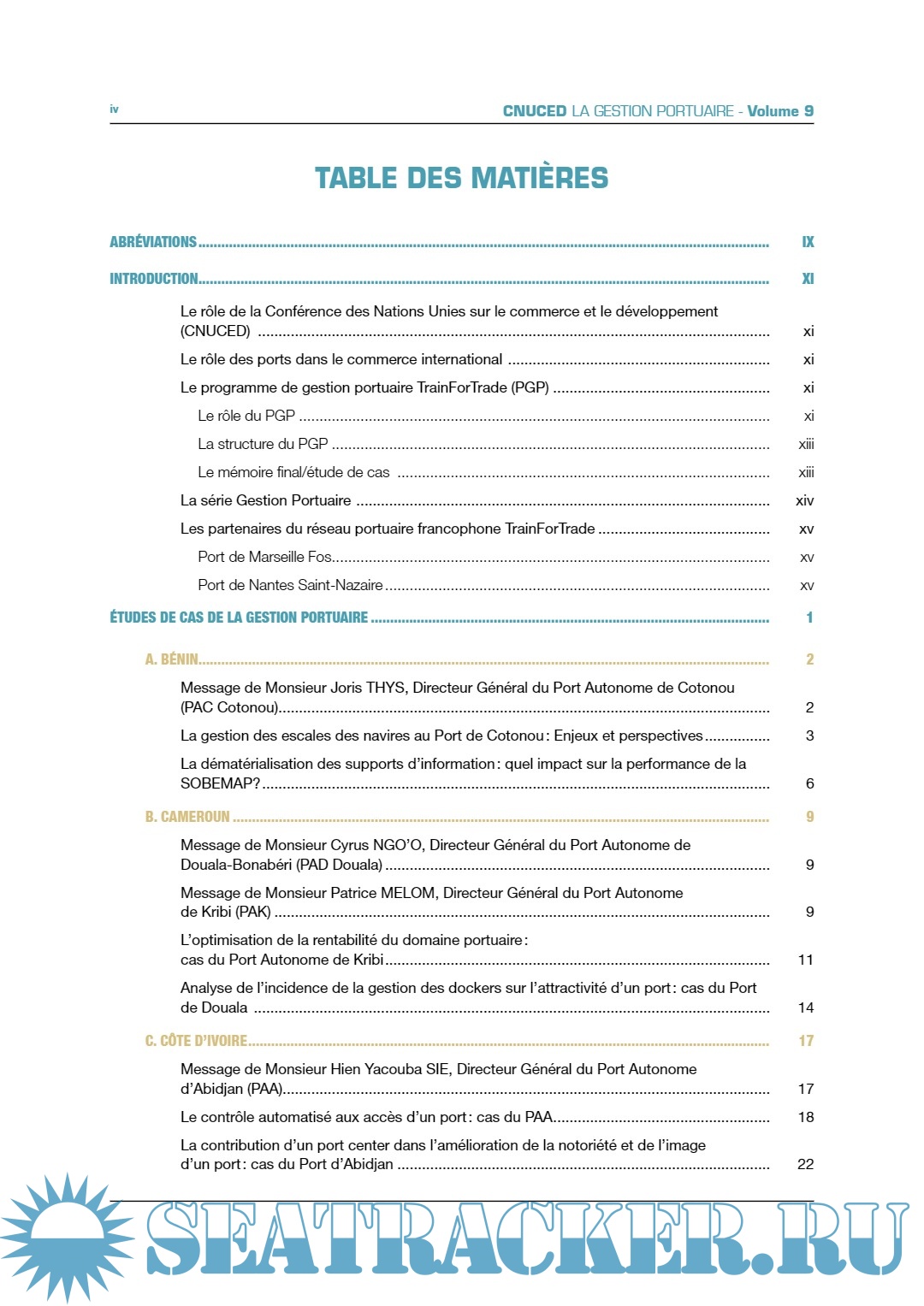 Description: Cette publication a été produite dans le cadre des activités du Programme de Gestion Portuaire TrainForTrade de la Conférence des Nations Unies sur le commerce et le développement (CNUCED). Elle a été financée par les ports du Bénin, du Cameroun, de la Côte d'ivoire, du Gabon, de la Guinée, d’Haïti, du Sénégal et du Togo. Ce projet a aussi reçu le soutien des grands ports maritimes de Nantes Saint-Nazaire et de Marseille Fos, France.