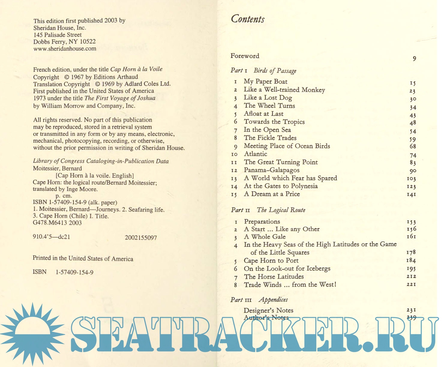 Year: 2003 Language: English Author: Bernard Moitessier Genre: Textbook Publisher: Sheridan House Edition: First ISBN: 978-1574091540 Format: PDF Quality: Scanned pages Pages count: 251 Description: This is the story of Bernard and Françoise Moitessier's honeymoon voyage aboard Joshua, sailing from Europe to the islands of the Pacific and back by way of Cape Horn, the "logical route," because it was the fastest. Setting out from Tahiti, they make their way through the Roaring Forties, iceberg territory, and the relentless gale-force winds of the higher latitudes. They owe their survival to careful preparation, superior seamanship, and their sens of harmony with Joshua and the sea. Cape Horn is also the tale of how Joshua, Moitessier's dream boat, became a reality, and how he recovered from the disaster of losing his previous boat--which he himself had built--to pursue his great love: sailing the world's oceans. Additional info: About the Author Bernard Moitessier was one of the world's great small-baot sailors. He wrote four other books, all classics of nautical literature. Sailing to the Reefs was Moitessier's first book. The Long Way covered the famous Golden Globe race that he abandoned to "save [his] soul." A Sea Vagabond's World is a practical book and Tamata and the Alliance, finished shortly before his death in 1994, is the magnificent autobiography of this uncommon man.