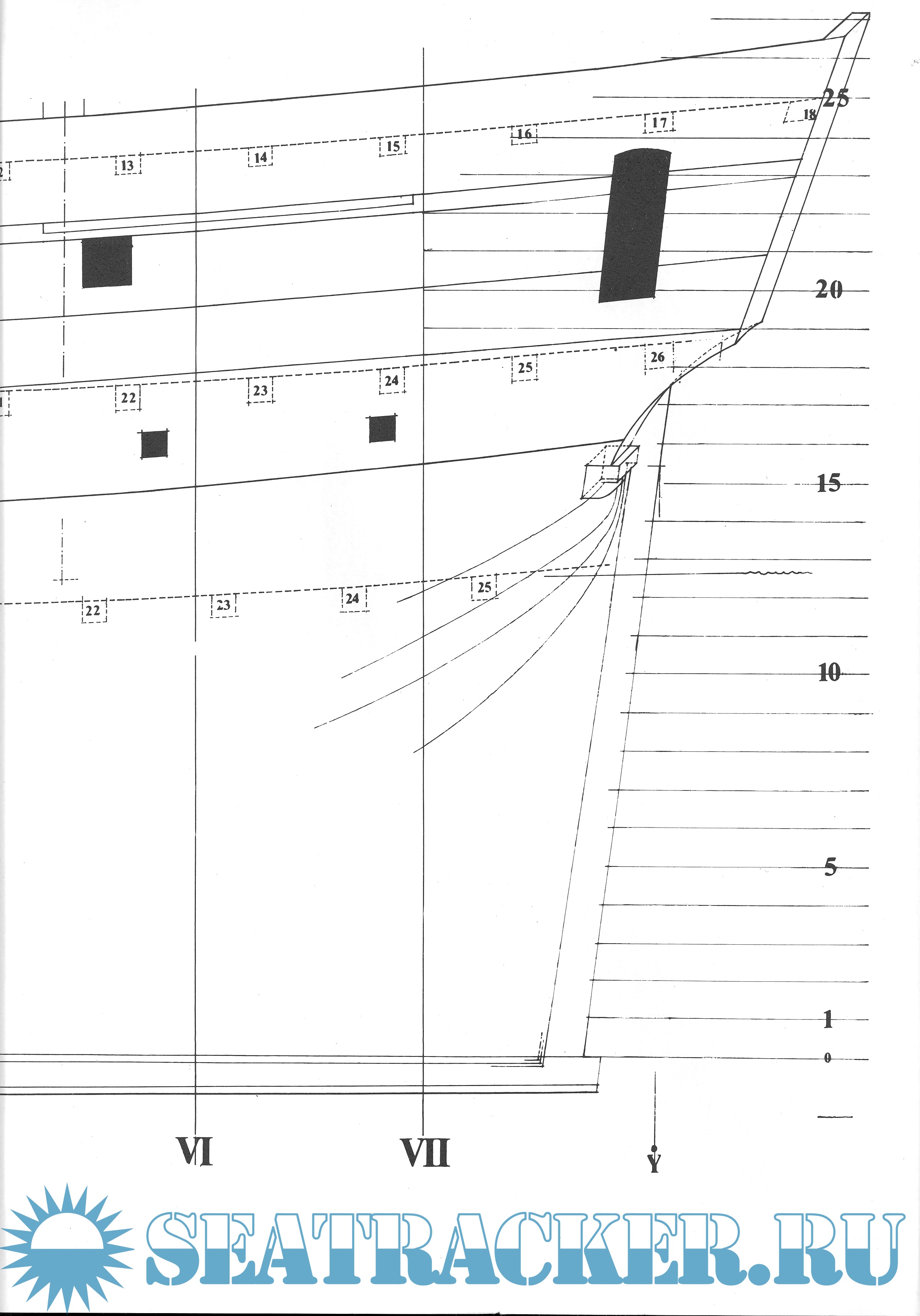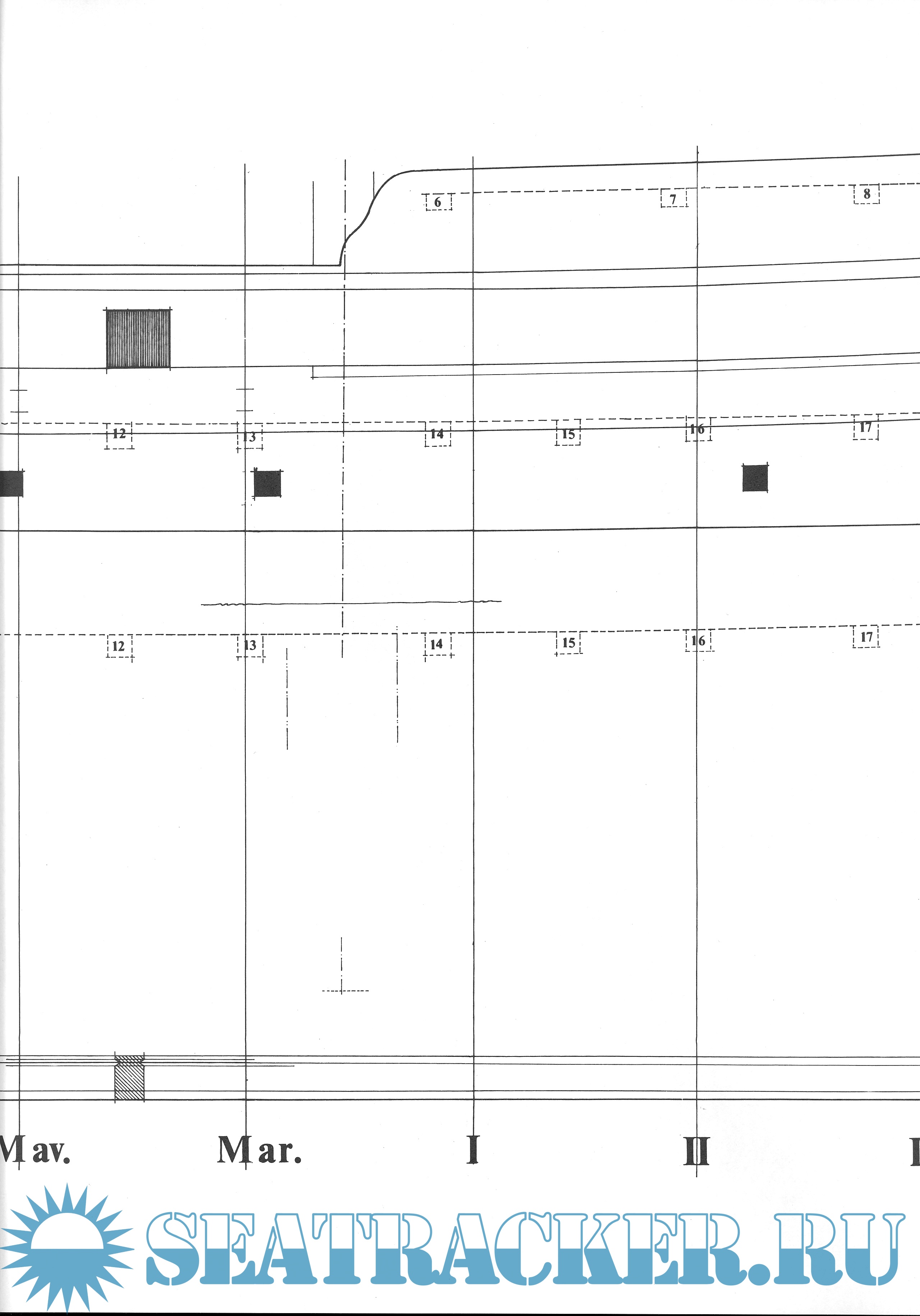 Описание: Чтобы предоставить все схемы, нужные для постройки корпуса и необходимых на невольничьем корабле помещений, понадобилось 47 листов чертежей большого формата.