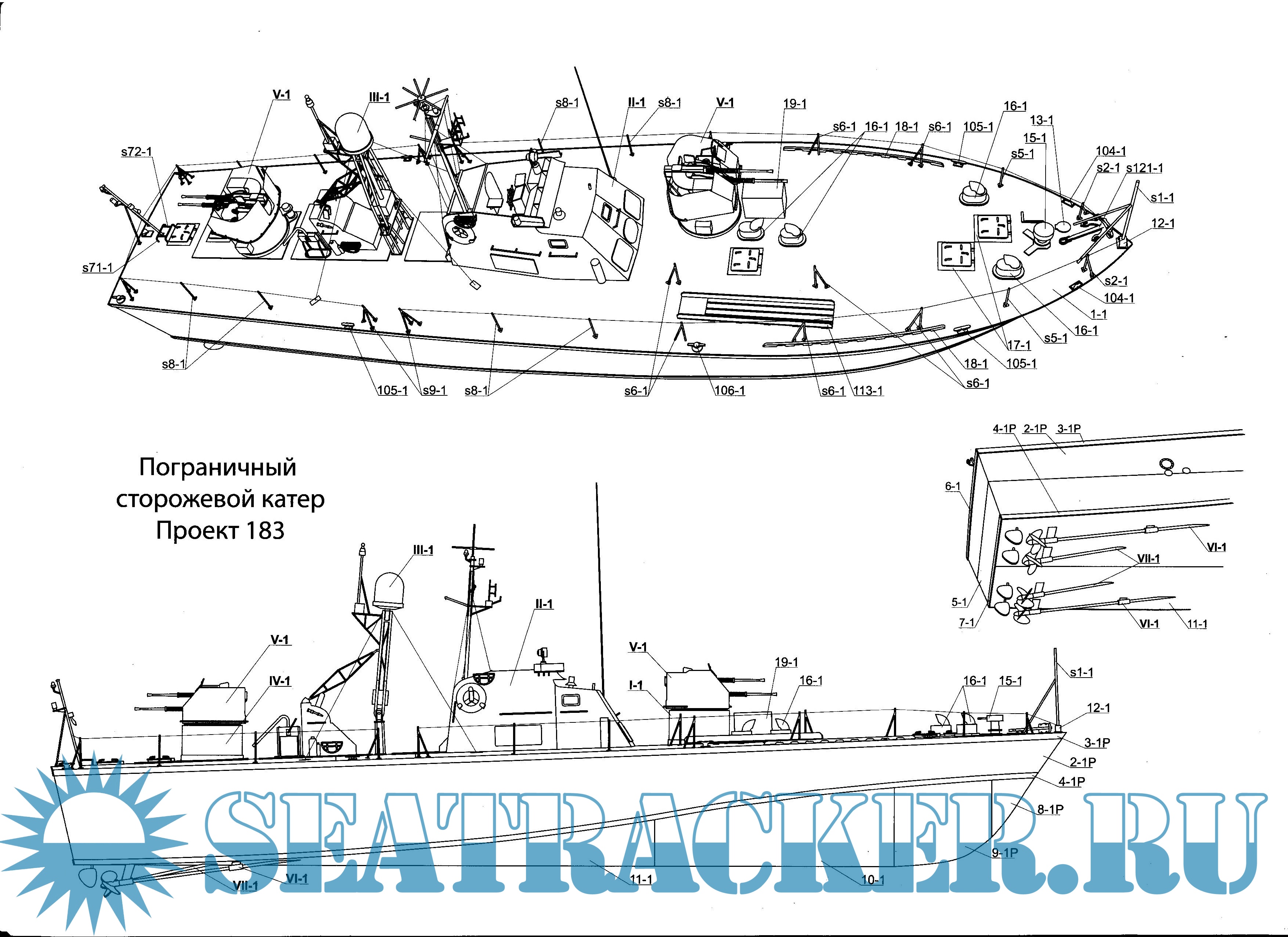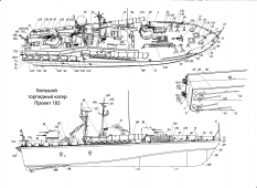 Описание: 23 листа цветных выкроек и инструкций для изготовления бумажной модели большого торпедного катера или пограничного катера проекта 183 или катера-цели проекта 183Ц (шифр "Большевик") в масштабе 1:100