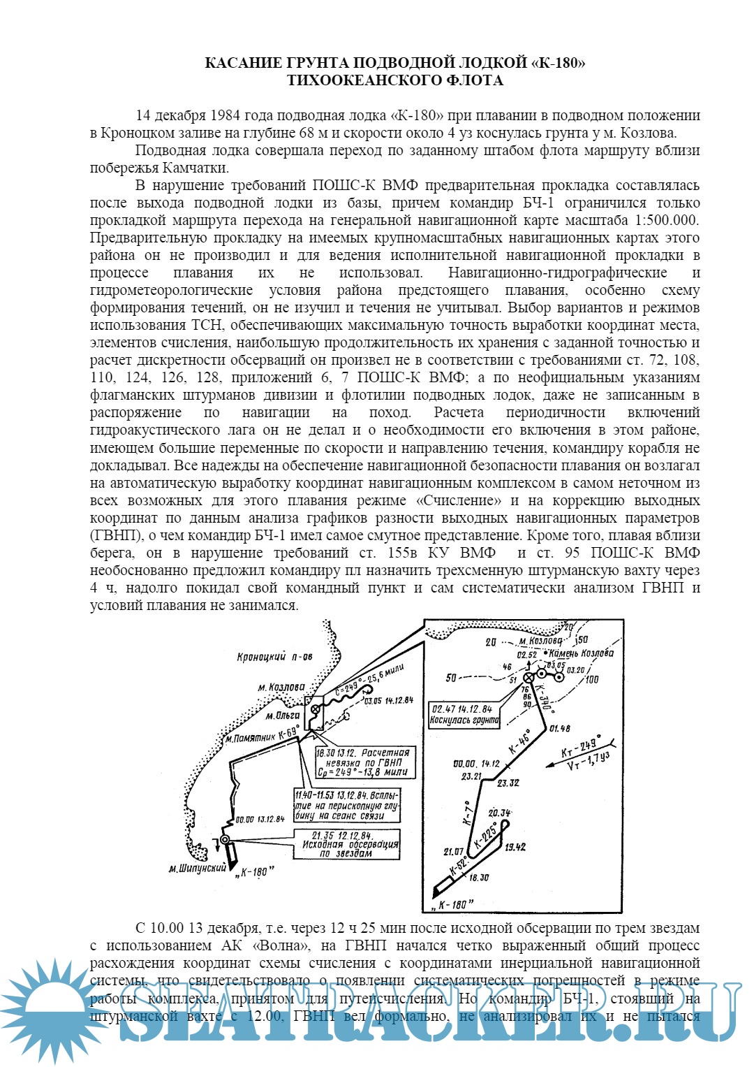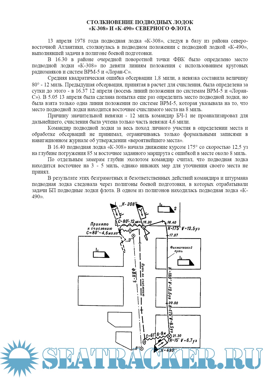 Год выпуска: 2011 Язык: русский Автор: неизвестен Жанр: Сборник книг Формат: PDF/DOC Качество: Изначально компьютерное (eBook) Количество страниц: 248 Описание: 13 апреля 1978 года подводная лодка «К-308», следуя в базу из района северо-восточной Атлантики, столкнулась в подводном положении с подводной лодкой «К-490», выполнявшей задачи в полигоне боевой подготовки. В 16.30 в районе очередной поворотной точки ФВК было определено место подводной лодки «К-308» по девяти линиям положения с использованием круговых радиомаяков и систем ВРМ-5 и «Лоран-С». Средняя квадратическая ошибка обсервации 1,8 мили, а невязка составила величину 80 - 12 миль. Предыдущая обсервация, принятая в расчет для счисления, была определена за сутки до этого - в 16.37 12 апреля (восемь линий положения по системам ВРМ-5 и «Лоран-С»). В 5.05 13 апреля была сделана попытка еще раз определить место подводной лодки, но была взята только одна линия положения по системе ВРМ-5, которая указывала на то, что место подводной лодки находится восточнее счислимого места на 8 миль. Причину значительной невязки - 12 миль командир БЧ-1 не проанализировал для дальнейшего, счисления была учтена только часть невязки 4,6 мили. Командир подводной лодки за весь поход личного участия в определении места и обработке обсерваций не принимал, ограничиваясь только формальными записями в навигационном журнале об утверждении «вероятнейшего места». B 16.40 подводная лодка «К-308» начала движение курсом 175 со скоростью 12,5 уз на глубине погружения 85 м восточнее заданного маршрута с ошибкой в месте около 8 миль. По отдельным замерам глубин эхолотом командир считал, что подводная лодка находится восточнее на 3 - 5 миль, однако никаких мер для уточнения своего места не принял. Доп. информация: «… часто истинная причина аварии лежала не в действии неотвратимых и непреодолимых сил природы, не в неизбежных случайностях на море, а в непонимании основных свойств и качеств корабля, несоблюдении правил службы и самых простых мер предосторожности, непонимания опасности, в которую корабль ставится, в небрежности, неосторожности, отсутствии предусмотрительности». - А.Н. Крылов «Собрание трудов». Т.1. Издание АН СССР, 1951, стр.62