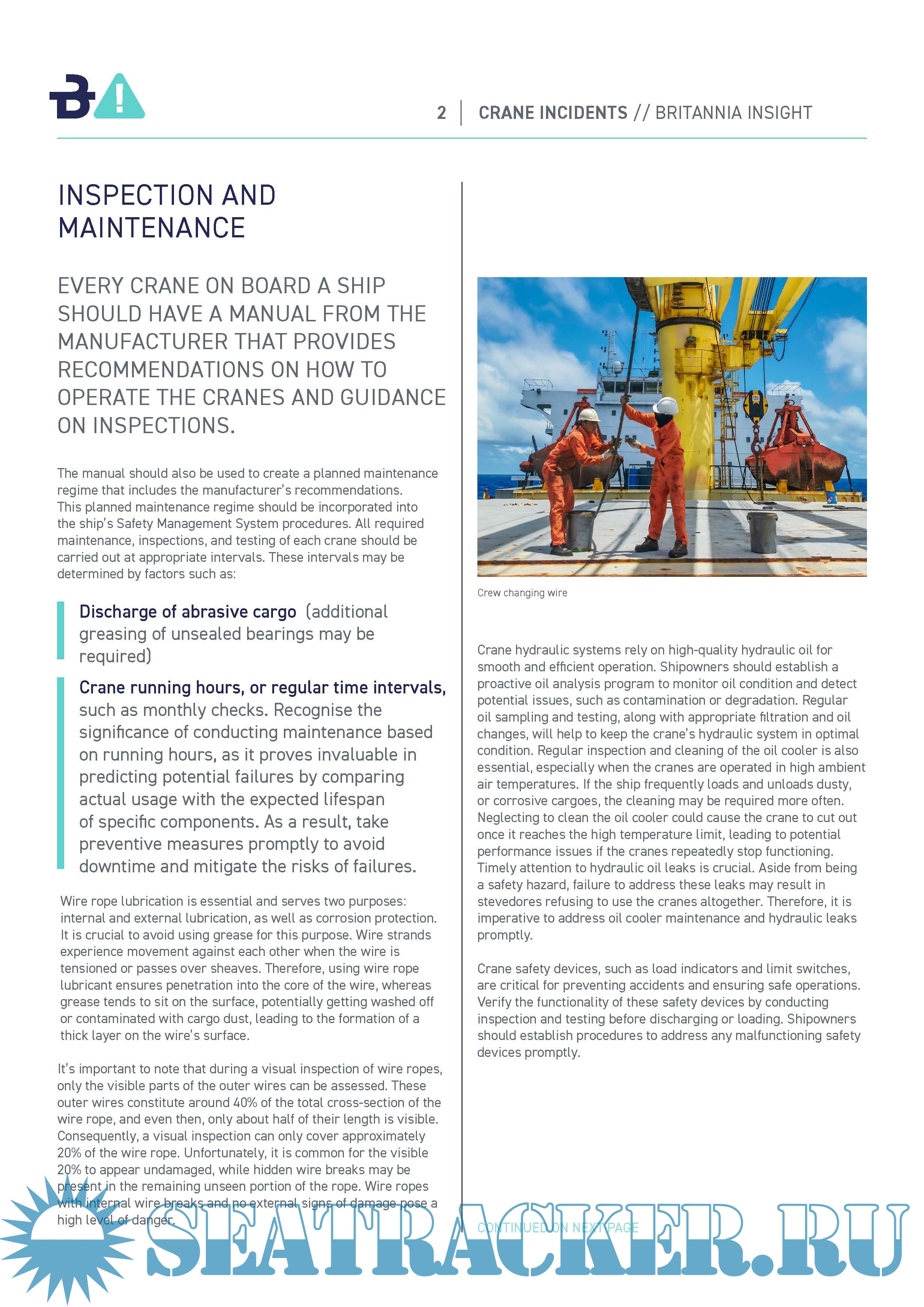 Year: 2024 Language: English Author: Britannia P&I Club Genre: Periodical Format: PDF Quality: eBook Pages count: 8 Description: Britannia P&I Club Loss Prevention Insight. LP insight on the importance of inspection, maintenance, and certification of cranes on ships for safe and efficient operations. Cranes play a vital role in shipboard operations, facilitating the efficient loading and unloading of cargo, and supporting various maritime activities. They are essential for lifting heavy loads, and their inspection, maintenance, and certification are crucial for ensuring the safety of personnel and the protection of valuable cargo.
