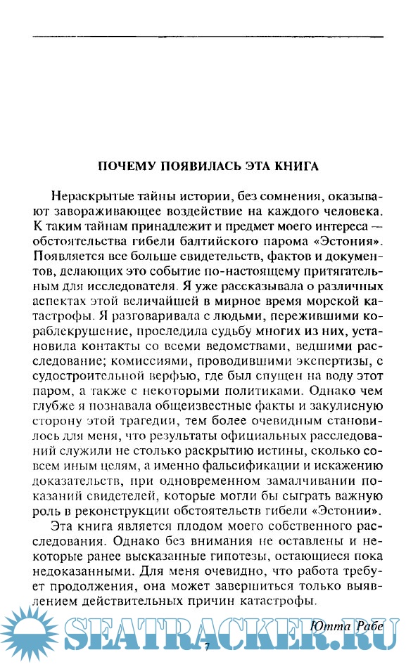 Год выпуска: 2007 Язык: русский Автор: Рабе Ютта Жанр: История Издательство: Центрполиграф Формат: PDF Качество: Изначально компьютерное (eBook) Количество страниц: 298 Описание: Загадки истории, несомненно, завораживают каждого, кто к ним прикасается. К таким тайнам относится и крушение парома "Эстония", которое произошло в ночь с 27 на 28 сентября 1994 года. В результате трагедии погибло 852, а спаслось всего 137 человек. Немецкая журналистка и продюсер Ютта Рабе провела свое расследование.