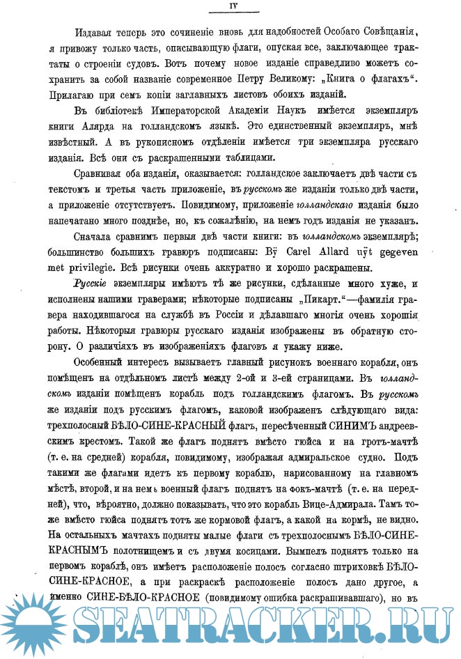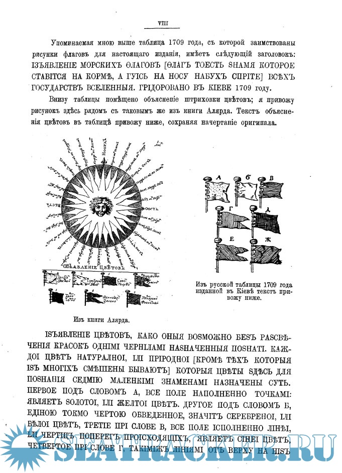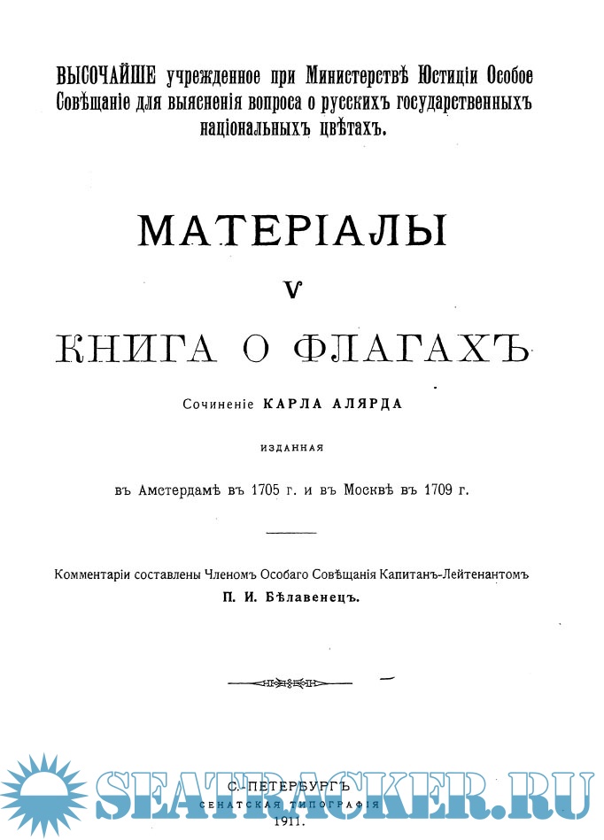 Описание: Сочинение Карла Алярда, изданное в Голландии в 1705 году под названием "Корабельные флаги" и отпечатанное на русском языке в 1709 году, является одним из наиболее ранних трудов по вексиллологии.