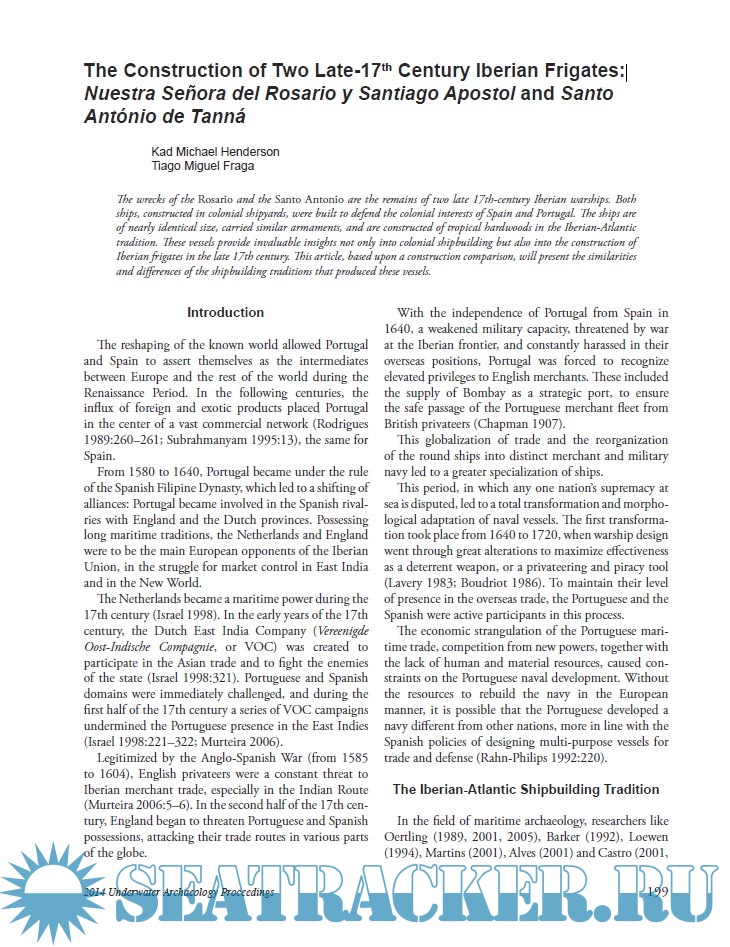 Description: he wrecks of the Rosario and the Santo Antonio are the remains of two late 17th-century Iberian warships. Both ships, constructed in colonial shipyards, were built to defend the colonial interests of Spain and Portugal. he ships are of nearly identical size, carried similar armaments, and are constructed of tropical hardwoods in the Iberian-Atlantic tradition. hese vessels provide invaluable insights not only into colonial shipbuilding but also into the construction of Iberian frigates in the late 17th century. his article, based upon a construction comparison, will present the similarities and diferences of the shipbuilding traditions that produced these vessels.