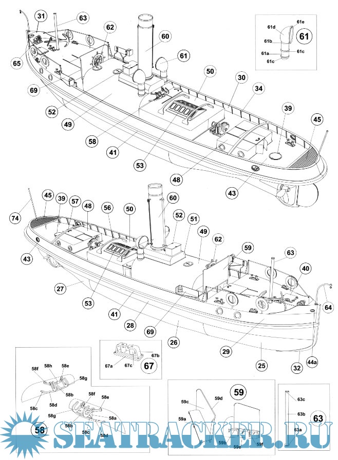 19 листов цветных выкроек и инструкций для изготовления бумажной модели буксира Мариинской водной системы в масштабе 1:100