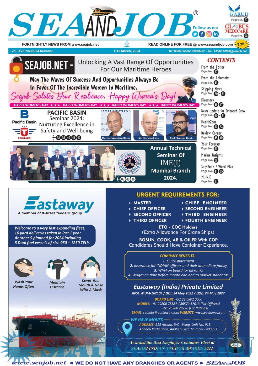 Year: 2024 Language: English Author: Sea Line Group Genre: Periodical (magazine) Edition: Vol. XVII, No. 05/24 Format: PDF Quality: eBook Pages count: 76 Description: The Sea and Job magazine launched in May 2007, was the second venture of Sea Line Group succeeding 'seajob.net' bringing the much renowned essence to the Group, the Sea and Job Magazine quickly gained popularity, becoming the No. 1 Shipping Magazine that came to be widely circulated all over India. Sea and Job over the years has evolved as the most trusted, ethical, objective and read maritime publication that possesses a large database of subscribers from various verticals in the industry.The magazine provides informative and interesting articles covering not just the shipping world but also the world outside it.Sea and Job is also a medium for the shipping/ manning companies to advertise marine jobs and also to promote their organization by publicizing internal activities like seminars, sports events and parties.Some notable endeavors of the magazine include the Know Your Recruiter Column, the Sailing Episodes Column and the Marine Insights section. The consistent efforts and the dedication to provide extraordinary services to the industry has resulted in the magnifying popularity and patronage of Sea and Job. Additional info: 1-15 March 2024.