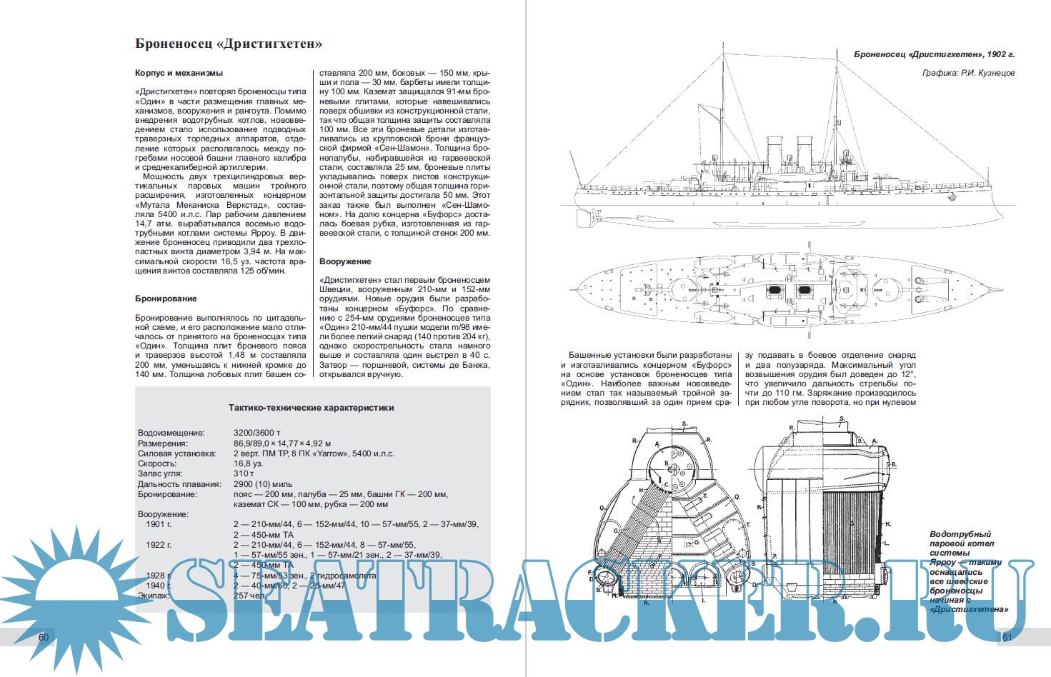 Описание: «Пренебрегать Швецией ради малочисленности ее населения и наших бывших побед над нею было бы неосновательно. Достаточно видеть ее флот и армию, хотя немногочисленные, но содержащиеся в изумительном порядке и примерной боевой готовности, чтобы понять, что военные недоразумения с нею вызовут значительные усилия с нашей стороны», – писал в 1910 г. русский посланник в Стокгольме. Тогда после гибели в Цусимском сражении основных сил Балтийского флота, Швеция впервые с начала XVIII в. стала сильнейшей на Балтике морской державой. Броненосцы, главная ударная сила шведского флота (Svenska marinen), находились в его составе более девяноста лет (всего шведы построили 15 броненосцев шести различных типов).