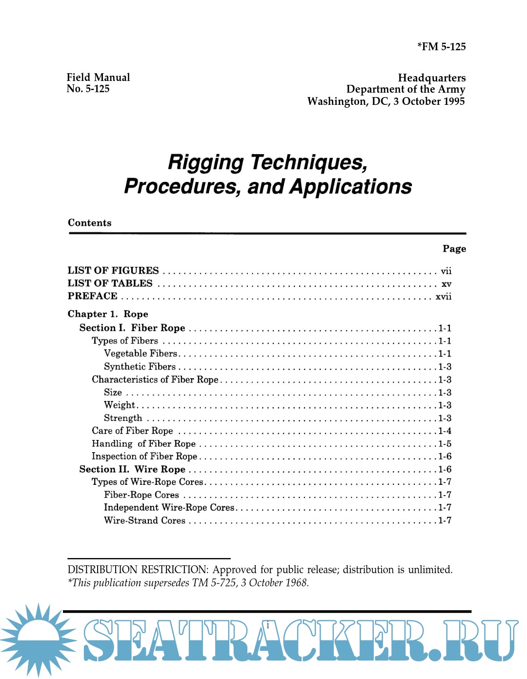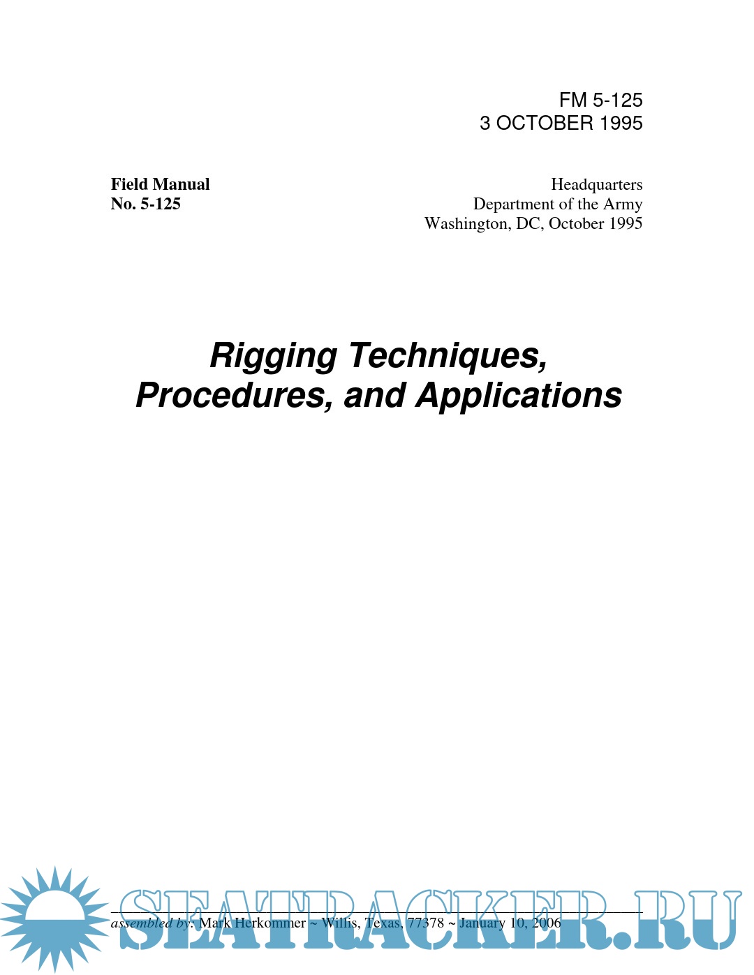 Year: 1995 Language: English Author: Headquarters Departament of the Army Genre: Manual Publisher: Headquarters Departament of the Army Format: PDF Quality: Scanned pages Pages count: 184 Description: Rigging Techniques, Procedures, and Applications