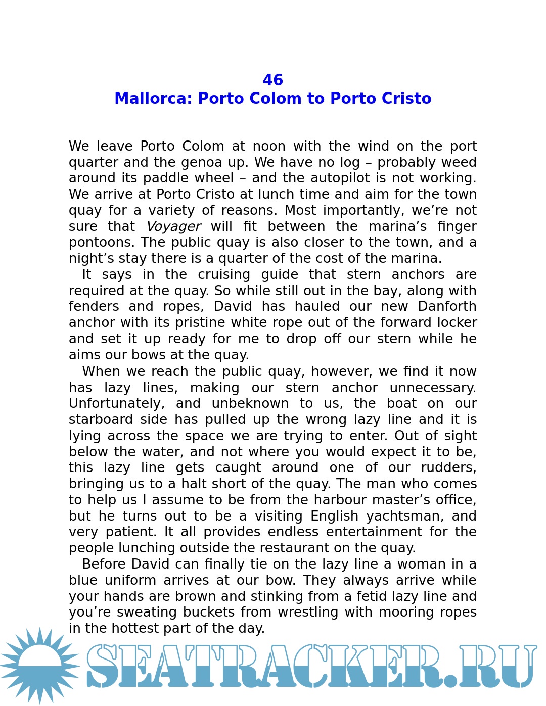 Description: Proving that sailing is not just the husband's pursuit, this charming narrative of one couple's first long distance voyage is told from the wife's perspective. Writing in a lively, humorous way, Sandra Clayton gives an entertaining account of her and husband David's maiden cruise from the UK, down the Atlantic coast and into the warm waters of the Mediterranean. Conscious that old age or poor health could prevent them from sailing away for much longer, they left the world of work behind to chase their dream of adventure. Conditions are sometimes maddening, occasionally dangerous, but frequently magical. Marine creatures enchant their days while ships that pass in the night add a touch of romance.