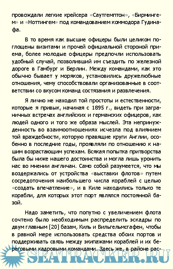 Описание: Мемуары адмирала Рейнгарда фон Шеера (1863—1928) рассказывают о действиях военно-морских сил Германии в Первую мировую войну. С начала войны Шеер командовал соединением линейных кораблей, в январе 1916 года он был назначен на пост командующего Флотом Открытого моря, в мае того же года руководил германскими силами в знаменитом Ютландском сражении, а позже стал “отцом” стратегии неограниченной подводной войны. Написанные вскоре после окончания войны, воспоминания командующего германским флотом отражают немецкую точку зрения на ход и итоги морского противостояния Британии и Германии.