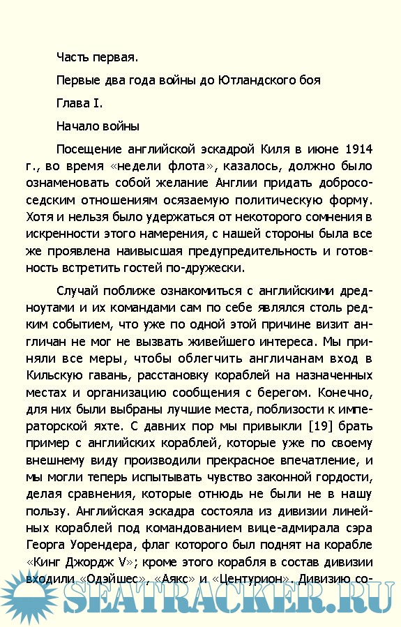 Содержание Предисловие Введение Часть первая. Первые два года войны до Ютландского боя Глава I. Начало войны Глава II. Соотношение сил и стратегическое положение Глава III. В ожидании неприятельского нападения Глава IV. Вторжение англичан в Германскую бухту Глава V. Осенние и зимние месяцы первого года войны Глава VI. Обстрел Скарборо и Хартлпула и бой крейсеров у Доггер-банки Глава VII. Ход войны в 1915 году Глава VIII. Подготовка к усилению деятельности флота Глава IX. Операции в Хуфдене. Обстрел Ярмута и Лоустофта Часть вторая. От Ютландского боя до начала неограниченной подводной войны Глава X. Ютландский бой Глава XI. После боя Глава XII. Налеты воздушных кораблей Часть третья. Подводная война Глава XIII. Военно-политическое значение подводной войны Глава XIV. Наши подводные лодки и их тактика Глава XV. Деятельность флота под знаком подводной войны Глава XVI. Захват балтийских островов и занятие Гельсингфорса Глава XVII. Бои наших легких морских сил и операции флота у норвежских берегов Глава XVIII. Военно-морское командование Заключение Лорд Фишер и британский план войны на море (Вместо послесловия) Примечания Список иллюстраций