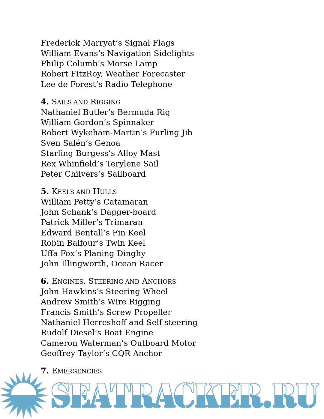 Year: 2011 Language: English Author: Drower G. Genre: History Publisher: The History Press Format: PDF/EPUB Quality: eBook Pages count: 203 Description: Which woman made the first solo transatlantic crossing? Who saved thousands of lives with the invention of navigation lights? What is the story behind the invention of the compass? Who was Francis Beaufort and how did he come to devise the Beaufort wind scale, still used to this day? Why did William Petty invent the catamaran (in 1662)? Many of us know the story of modern sailing pioneers -- Dame Ellen MacArthur and Francis Chichester, Claire Francis and the challengers of the Americas Cup -- but what about those unsung heroes who invented the mechanisms and technology which enabled sailors to speed across the oceans and navigate more safely? This fascinating book reveals the extraordinary stories behind the apparatus which many take for granted. Learn how the Frenchman Boulanger produced the first binoculars in 1859, enabling sailors to spy landmarks more effectively; or how William Armstrong earned sailors' gratitude by devising the yacht winch. From cloud classification and screw propellers to radio telephones and the measurement of tides, from the sextant to the first fibreglass boat, this collection of stories, with a foreword by Ben Ainslie, Olympic gold medal winner, will inspire and intrigue sailors everywhere.