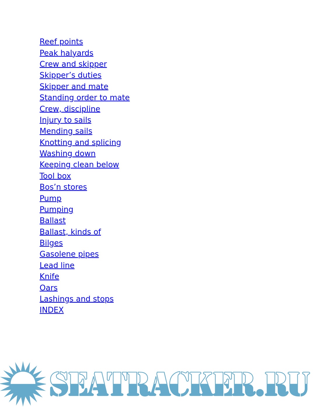 Year: 2022 Language: English Author: Day T.F. Genre: Dictionary Publisher: DigiCat ISBN: 8596547347569 Format: PDF Quality: eBook Pages count: 117 Description: In THIS book is the response to a constant appeal for information. During the last nine years I have received thousands of letters, asking for hints on all manner of subjects relating to the care, handling, buying and equipping of small yachts. The majority of these letters came from boys and young men living throughout the world, who were just entering the sport, and who were anxious to become skillful sailors and competent skippers. I can thoroughly understand their position, and sympathize with their desire for fuller and more practical knowledge than that contained in the majority of works upon yachting. What knowledge I possess of this art, or profession, I have gained by years of hard work and close observation, and having begun my studies when very young can testify to the dearth of literature of value to the green hand, who is looking for practical hints that will help him to become a skillful yacht sailor. Had I possessed a book like this, it would have saved me time, money and lots of hard work and anxiety. But, in using this book, it must be remembered that a hint is not a law or a command, it is simply a concise statement for you to take, think over, and make use of, if it appears to be logical and practical. There may be better and easier ways of doing many of these things I speak of—that is for you to find out. I am an authority only as far as my knowledge goes, and no further. The basis of my authority is my years of observation and experience; your right to confute my findings can only be based on similar premises. Unless you have tried and proved that my instructions are wrong, they are still good medicine. If a man, especially a young one, decide to go into yachting, he should also decide to learn the business of handling these craft from the keel up. It is not sufficient, as many of you think, that all that is necessary is to learn how to sail a boat about. You should know not only how to sail her, but you should know why she sails, and all about the gear and canvas used to propel her. You should learn to rig and unrig, to care for and to understand every part of her structure, both above and below decks. It is certainly a sorry spectacle to see a man sailing a yacht who cannot tie a proper knot, splice a rope, or bend a sail, and who does not know the terms used to designate parts of the structure which he essays to manage. If he is ashamed to learn, or if he is too lazy to gather such knowledge, he is out a place in a sport which is the life and joy of energetic, skillful and brave men. I hope all of my boys the world over who are coming into yachting, and to assist whom I have written these words, will never be ashamed to learn the sailor’s trade, or be too lazy to acquire all possible knowledge relating to the art of handling vessels. You will never regret having given your time to the study. It will bring to you that which is more valuable than the treasures of the earth; something that you can never be deprived of, no matter how unlucky or how unfortunate you may be—the respect paid to the skillful by the unskillful; the deference shown to the educated by the ignorant. It is as well to say here that these hints are not intended for men owning and sailing large yachts. Such vessels are too costly to be trusted in the hands of any men except those who are thoroughly competent; and if an owner has not sufficient skill to handle a large yacht it is his business to hire somebody who has. These hints are intended for the small-boat owner and skipper.