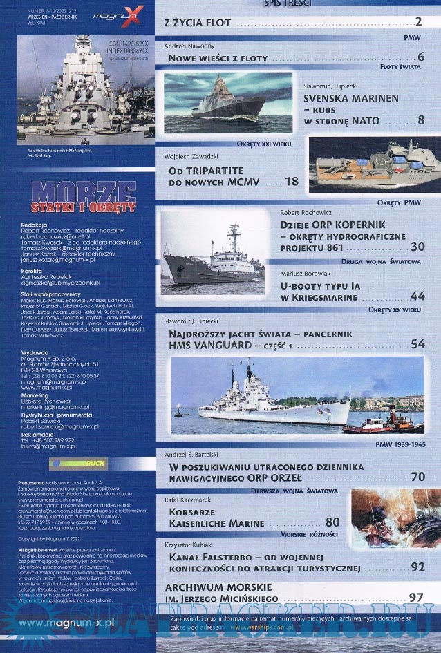 Description: Польский морской журнал. Издается с 1996 года, первоначально как ежеквартальный. С 1999 года издается раз в два месяца, а с 2007 года-как ежемесячный. Первоначально назывался Morza Statki i Okrety, в 2006 году переименован в Morze Statki i Okrety. С 2004 года полностью цветной (ранее только вставки). В 2008 году стали издаваться специальные выпуски, первоначально нерегулярные. С 2014 года выпускается как обычное издание и специальное издание, с непрерывной нумерацией.
