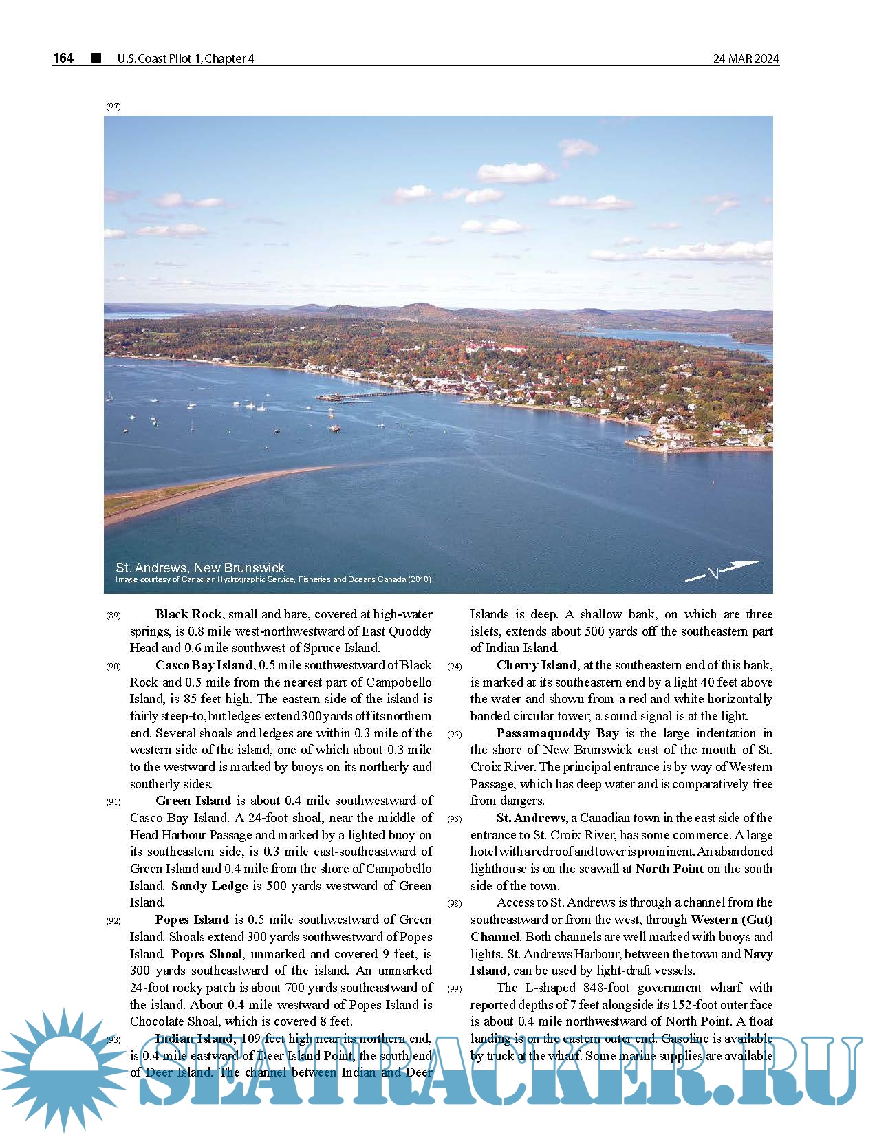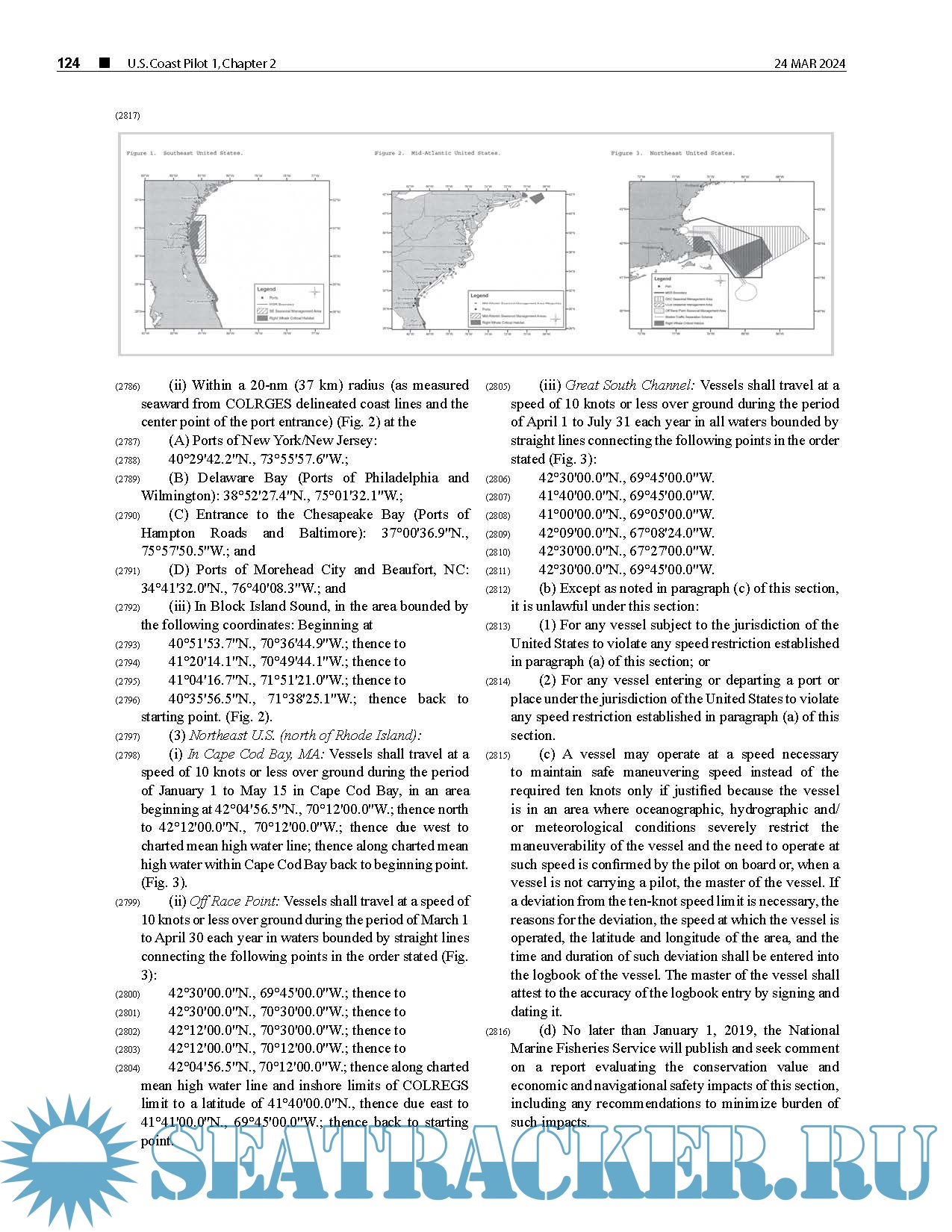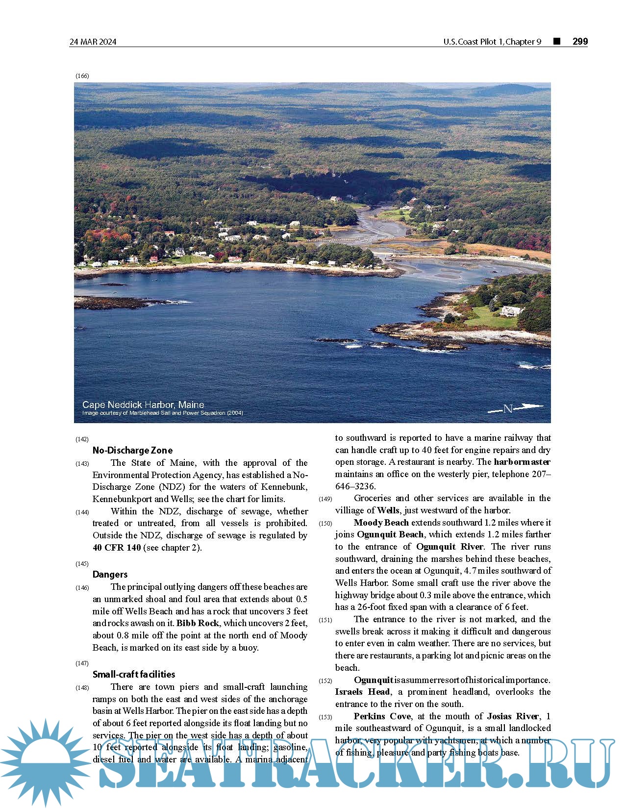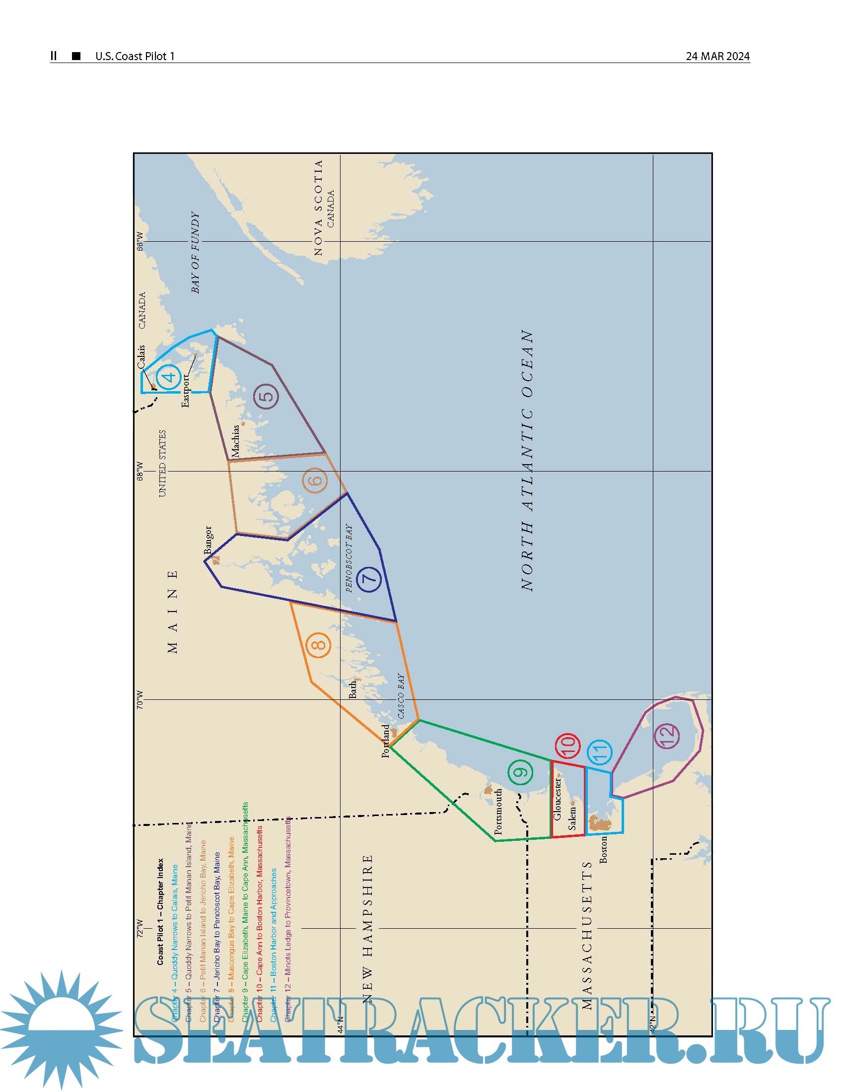 Year: 2024 Language: English Author: NOAA Genre: Documentation Edition: 2024 (54th) Edition Format: PDF Quality: eBook Pages count: 440 Description: The United States Coast Pilot® consists of a series of nautical books that cover a variety of information important to navigators of coastal and intracoastal waters and the Great Lakes. Issued in ten volumes, they contain supplemental information that is difficult to portray on a nautical chart. Topics in the Coast Pilot include channel descriptions, anchorages, bridge and cable clearances, currents, tide and water levels, prominent features, pilotage, towage, weather, ice conditions, wharf descriptions, dangers, routes, traffic separation schemes, small-craft facilities, and Federal regulations applicable to navigation. This edition cancels the 53rd Edition and includes all previously published corrections. Updated upto 24 March 2024