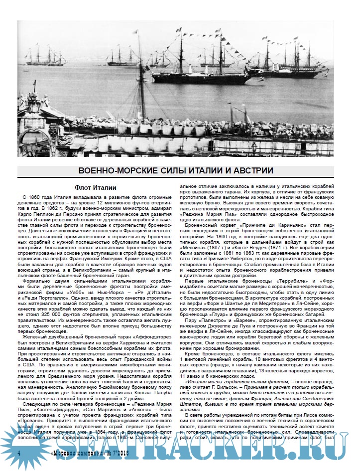 Год выпуска: 2016 Язык: Русский Автор: М.В. Ферапонтов, С.В. Патянин Жанр: Периодическое издание (журнал) Издание: 2016-07 Формат: PDF Качество: Изначально компьютерное (eBook) Количество страниц: 68 Описание: Данный тематический выпуск «Морской кампании» посвящен 150-летнему юбилею сражения при Лиссе, состоявшегося 20 июля 1866 г. Оно не только вошло в историю как первое крупное сражение броненосных флотов (не отдельных броненосцев, а именно флотов!) и вывело Австрию в число ведущих морских держав, но и оказало основополагающее влияние на развитие военного кораблестроения и тактики на последующие полстолетия. Сборник включает в себя характеристику военно-морских сил Италии и Австрии, описание хода военных действий на Адриатическом море в кампанию 1866 г. и собственно сражения при Лиссе, а также справочники по корабельному составу австрийского и итальянского флотов