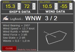Visually displays the ship direction and wind vector