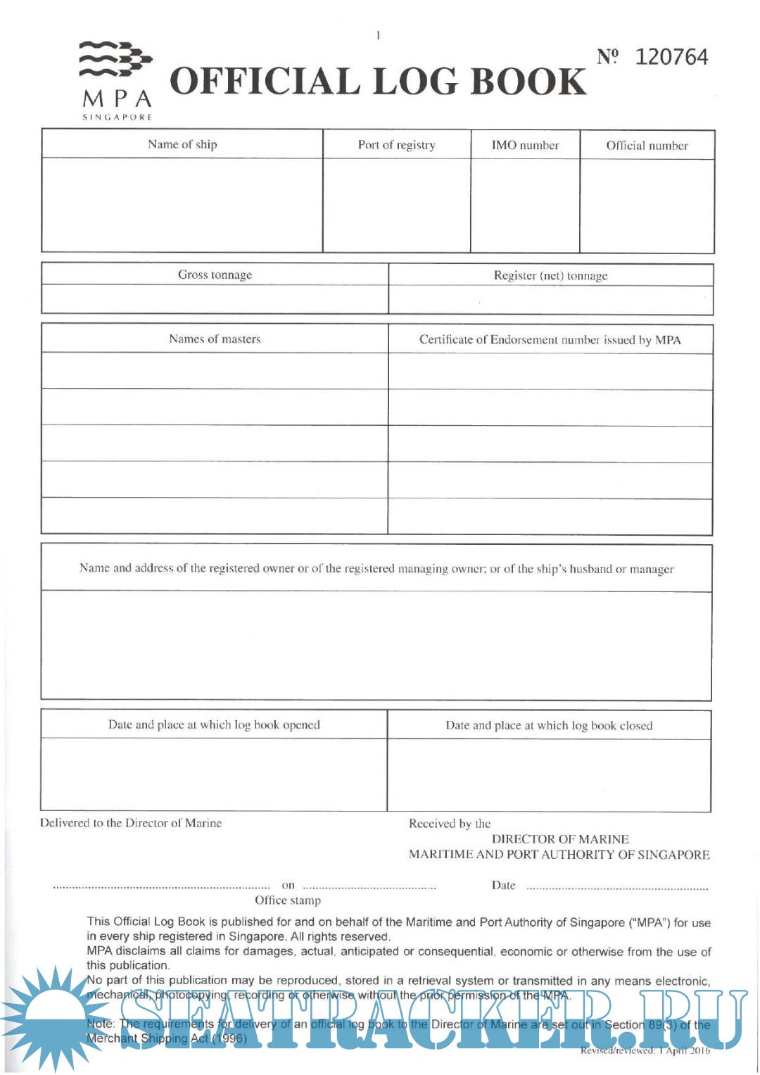 Description: Blank copy of Official Log Book published by Maritime and Port Authority of Singapore for use in every Singapore registered ship.
