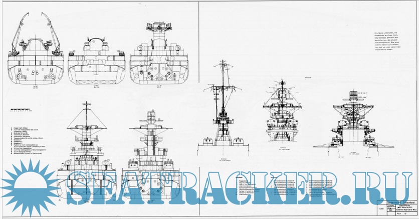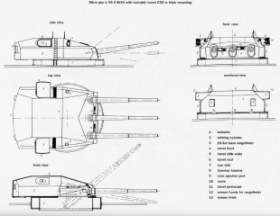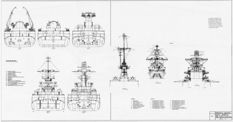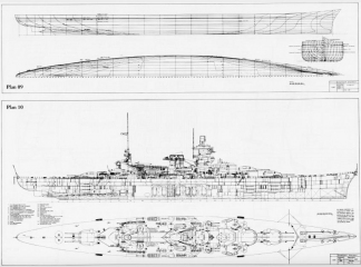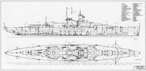 Description: Most of the content is pictures and drawings. The photos are all B&W, and most were taken of the ship underway or in action. There are a few of the interior of the vessel which is uncommon: some from the engineering spaces, one from what in USN parlance would be the CiC. There are several pages of pictures of large scale models: some of the original shipyard models, but most are of a more detailed and recently built 1/100 scale version in a museum.
