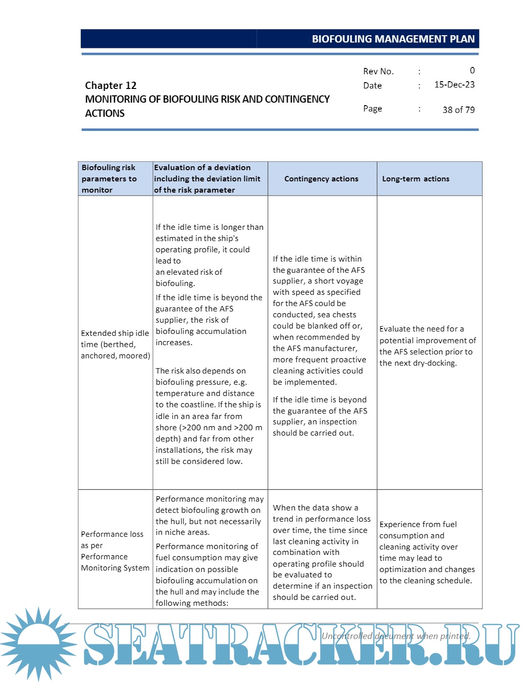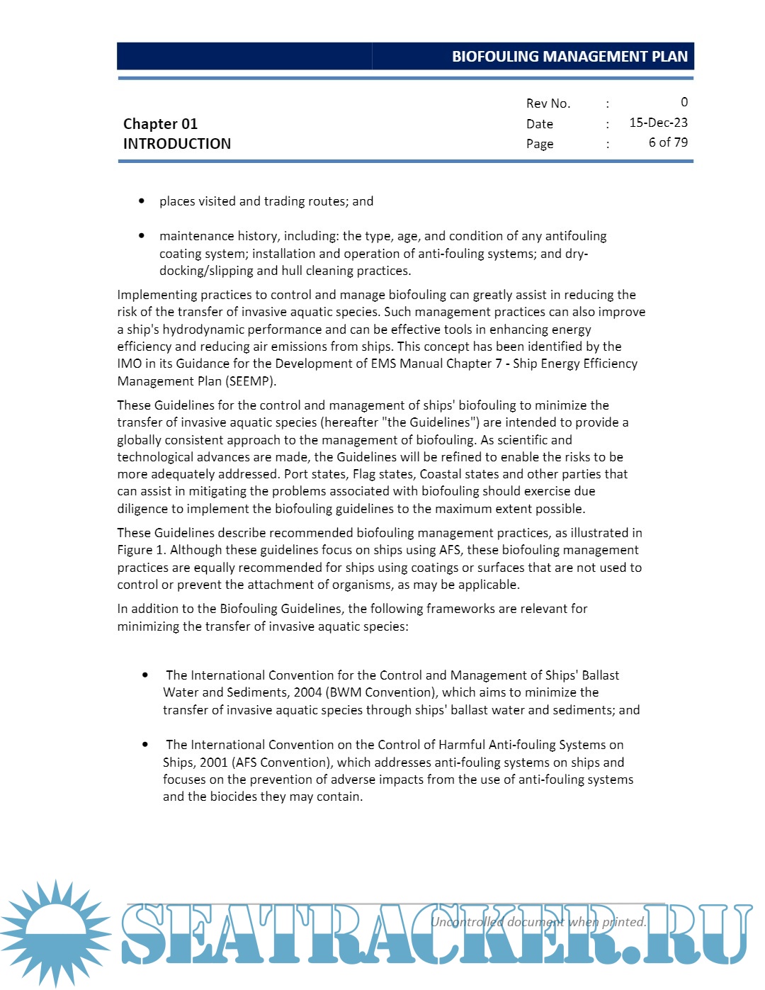 Year: 2023 Language: English Author: Synergy Maritime Pvt. Ltd. Genre: Manual Edition: 2 Format: PDF Quality: eBook Pages count: 79 Description: The purpose of the Plan is to outline measures for the control and management of this vessel’s biofouling to minimize the transfer of invasive aquatic species. This plan describes the biofouling management for the period between two scheduled drydockings which include application, reapplication, installation, or renewal of the AFS. The plan should be re-evaluated and, if necessary, updated after a dry-docking and/or if any changes are made that have an impact on the anticipated biofouling.