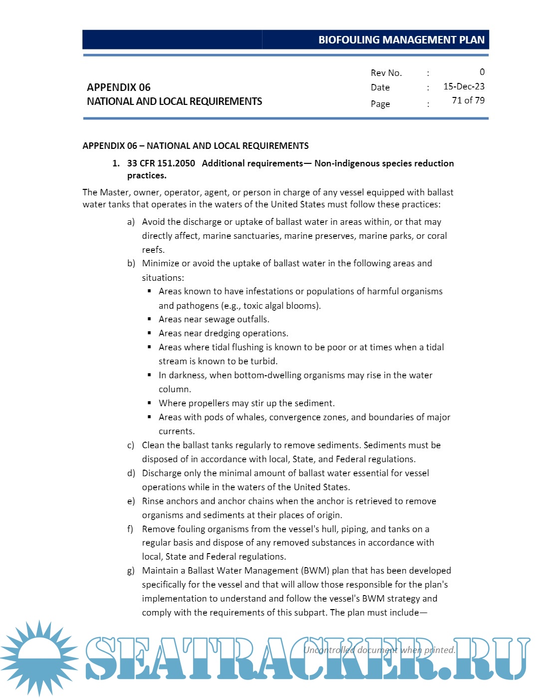 Description: The purpose of the Plan is to outline measures for the control and management of this vessel’s biofouling to minimize the transfer of invasive aquatic species.
