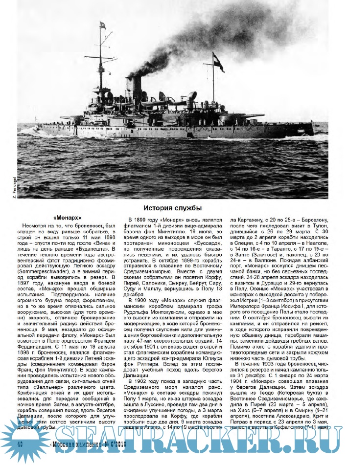 Центральный материал номера - статья историка хорватского происхождения Звонимира Фрайфогеля (Zvonimir Freivogel, Германия) об австро-венгерских броненосцах типа «Монарх». Перевод выполнил Леонид Анатольевич Олюнин (г. Котельнич Кировской обл.). Использована графика Станислава Шупика (Stanislav Supik) и Даниеля Фрка (Danijel Frka), предоставленная автором. Редакция выражает благодарность Н.В. Митюкову за помощь в подготовке материала к публикации.