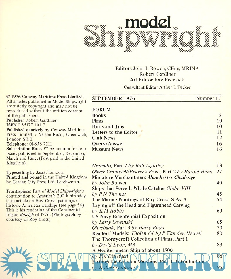 Year: 1976 Language: English Author: Bowen J Staff Genre: Periodical (magazine) Publisher: Conway Maritime Press Format: PDF Quality: Scanned pages Pages count: 104 Description: The international quarterly journal for ship modelmakers since 1972. Covering a wide variety of articles on all aspects of ship modelling, from the miniature ships themselves to the dioramas around them. Each issue complete with free large-scale modeller's draught. This quarterly journal, since its launch in 1972, has been regarded as the world's leading ship modelling publication. The mixture of articles, reviews, news and comment from modelmakers world-wide provides the best and most detailed information available anywhere, and is enhanced with authentic plans, clear diagrams and many photographs. Although the miniature ships are the most important feature of the journal, with articles explaining how individual models were researched and constructed, the other aspects of model making have not been forgotten - dioramas, modelling techniques, tools, and recent events are all covered. Each issue of the journal comes complete with a free large-scale modeller's draught with accompanying modelling notes, illustrations and specifications for a featured vessel.