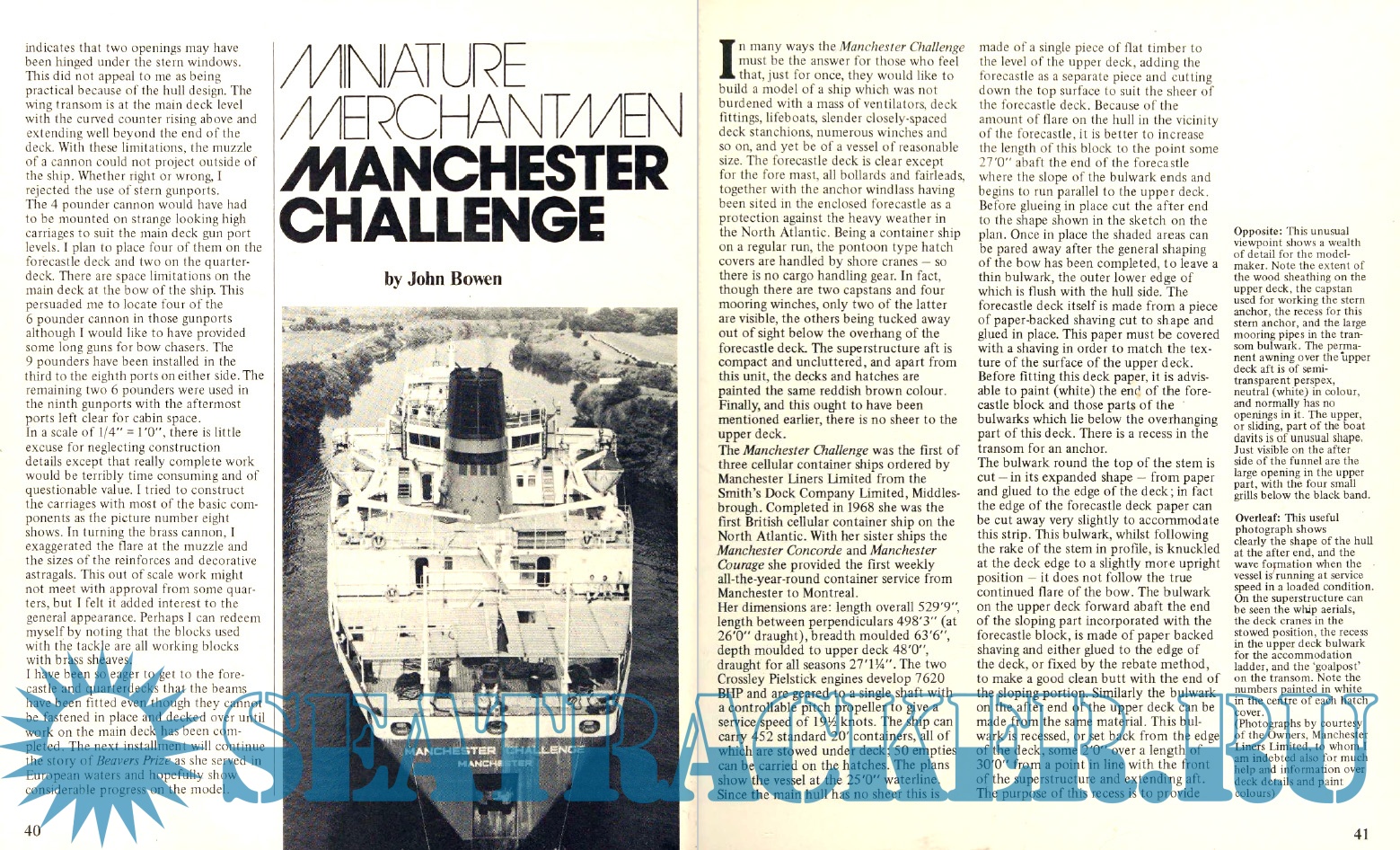 Description: The international quarterly journal for ship modelmakers since 1972. Covering a wide variety of articles on all aspects of ship modelling, from the miniature ships themselves to the dioramas around them. Each issue complete with free large-scale modeller's draught. This quarterly journal, since its launch in 1972, has been regarded as the world's leading ship modelling publication. The mixture of articles, reviews, news and comment from modelmakers world-wide provides the best and most detailed information available anywhere, and is enhanced with authentic plans, clear diagrams and many photographs. Although the miniature ships are the most important feature of the journal, with articles explaining how individual models were researched and constructed, the other aspects of model making have not been forgotten - dioramas, modelling techniques, tools, and recent events are all covered. Each issue of the journal comes complete with a free large-scale modeller's draught with accompanying modelling notes, illustrations and specifications for a featured vessel.