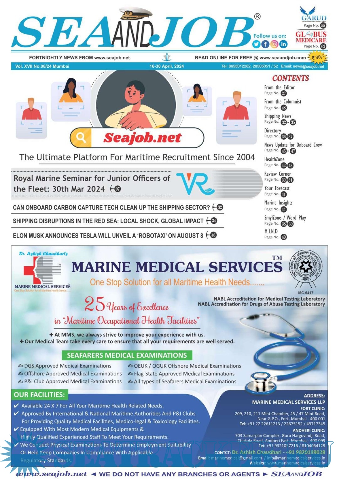Description: The Sea and Job magazine launched in May 2007, was the second venture of Sea Line Group succeeding 'seajob.net' bringing the much renowned essence to the Group, the Sea and Job Magazine quickly gained popularity, becoming the No. 1 Shipping Magazine that came to be widely circulated all over India. Sea and Job over the years has evolved as the most trusted, ethical, objective and read maritime publication that possesses a large database of subscribers from various verticals in the industry.The magazine provides informative and interesting articles covering not just the shipping world but also the world outside it.Sea and Job is also a medium for the shipping/ manning companies to advertise marine jobs and also to promote their organization by publicizing internal activities like seminars, sports events and parties.Some notable endeavors of the magazine include the Know Your Recruiter Column, the Sailing Episodes Column and the Marine Insights section. The consistent efforts and the dedication to provide extraordinary services to the industry has resulted in the magnifying popularity and patronage of Sea and Job.