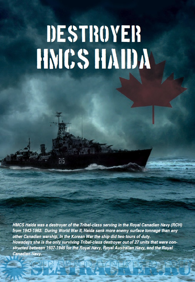 Description: HMCS Haida was a destroyer of the Tribal-class serving in the Royal Canadian Navy (RCN) from 1943-1963. During World War II, Haida sank more enemy surface tonnage than any other Canadian warship. In the Korean War the ship did two tours of duty.