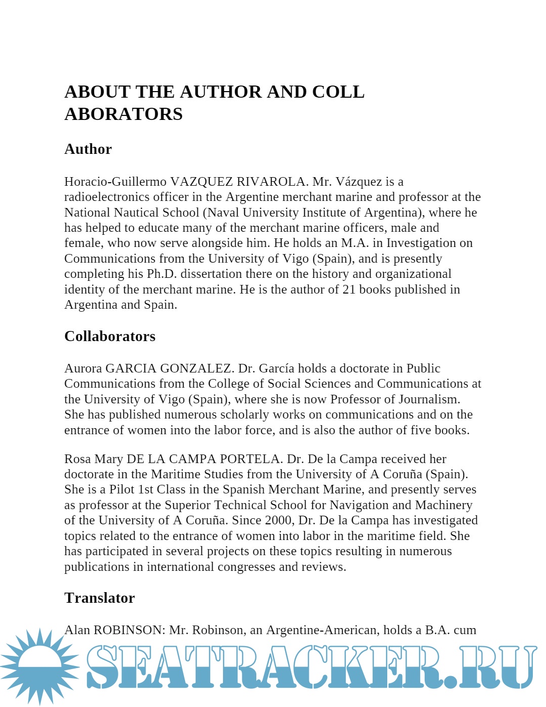 Beside the prolific and experienced author, Horacio Guillermo Rivarola Vázquez (Argentine National Nautical School and University of Vigo), collaborated in this work the doctors Aurora García González (University of Vigo) and Mary Rosa Portela de la Campa (Universidade da Coruña) .