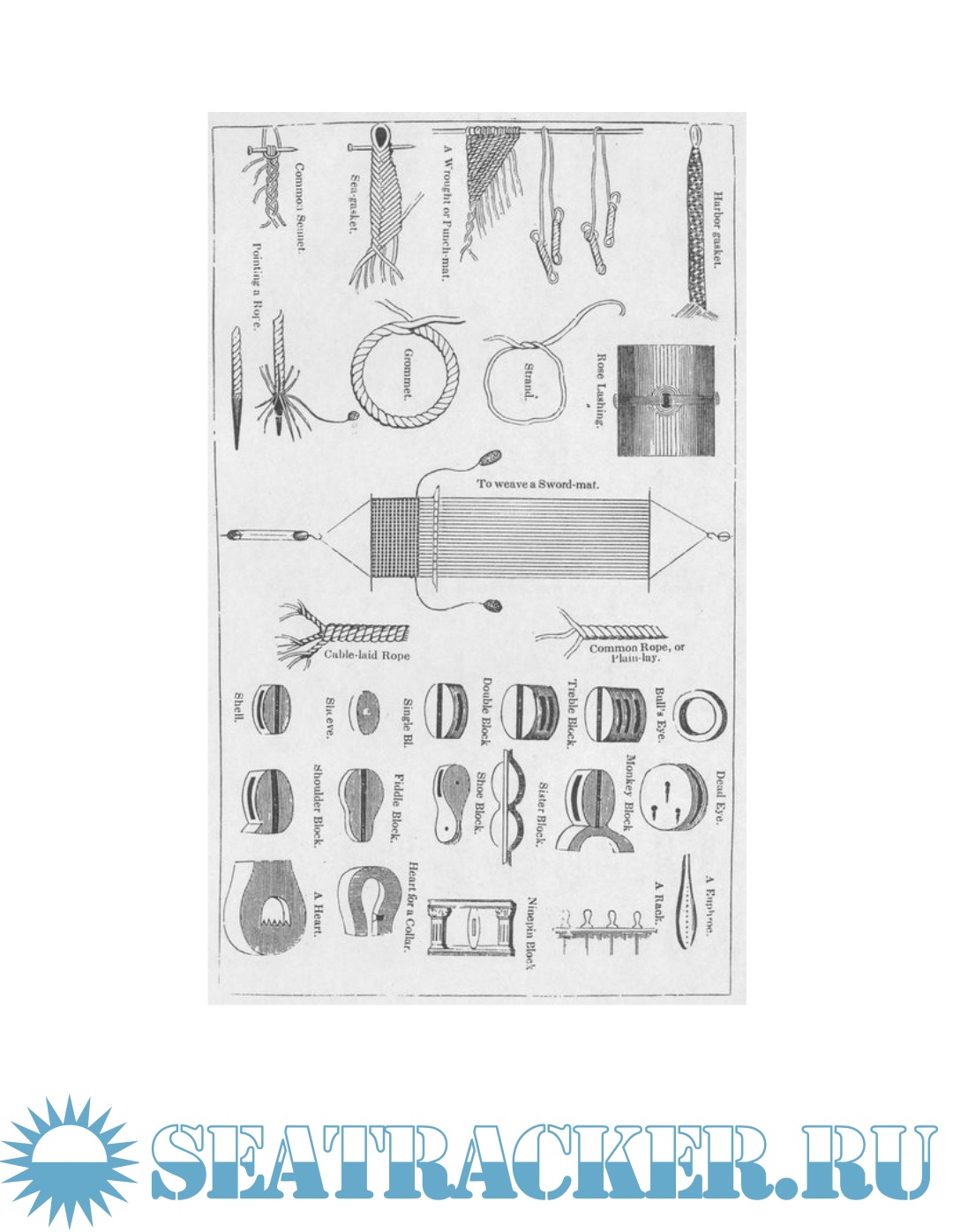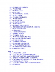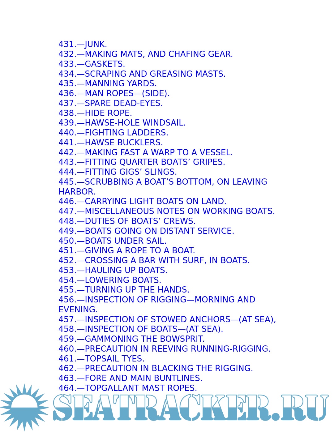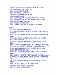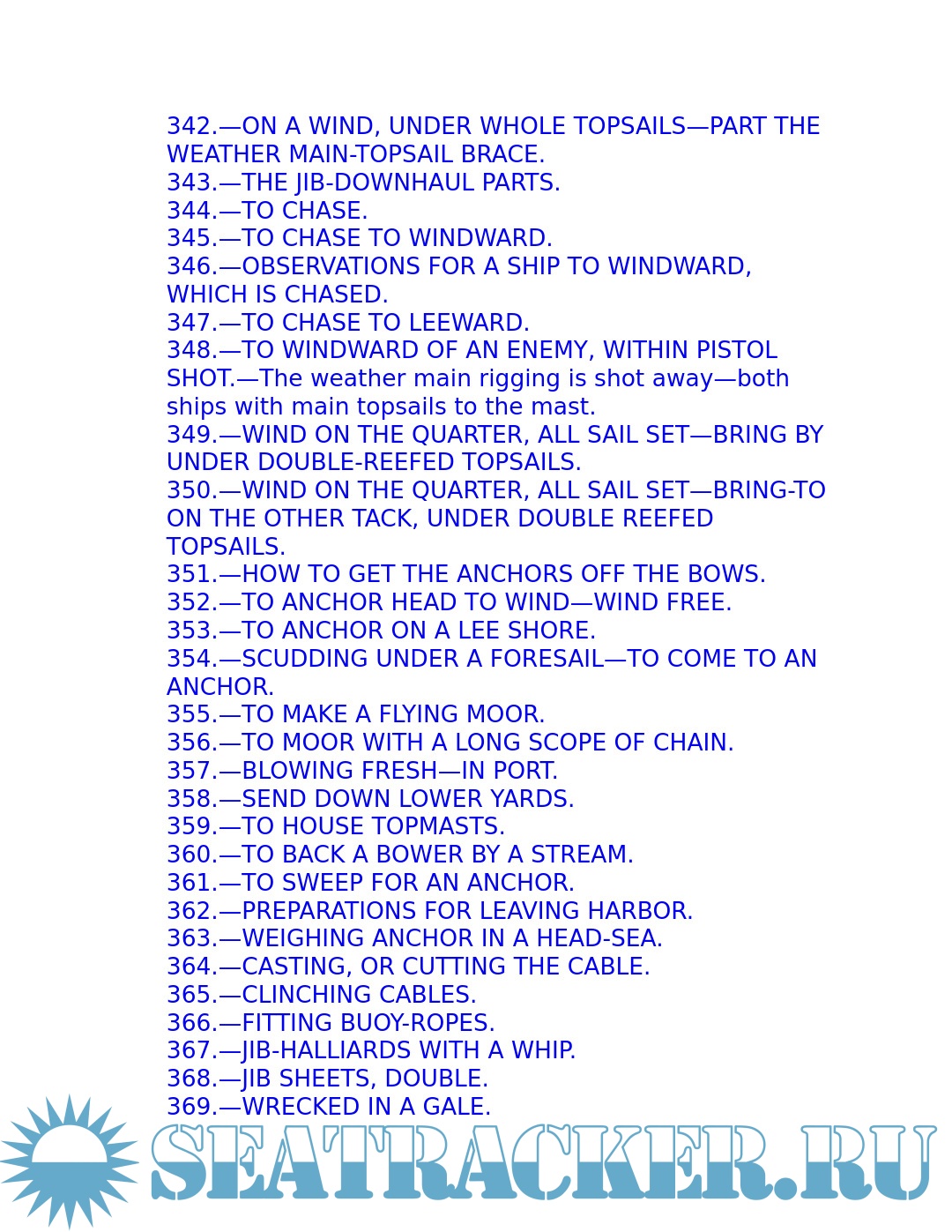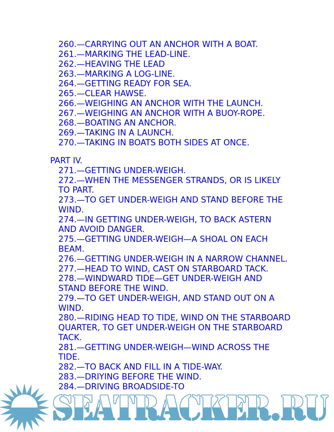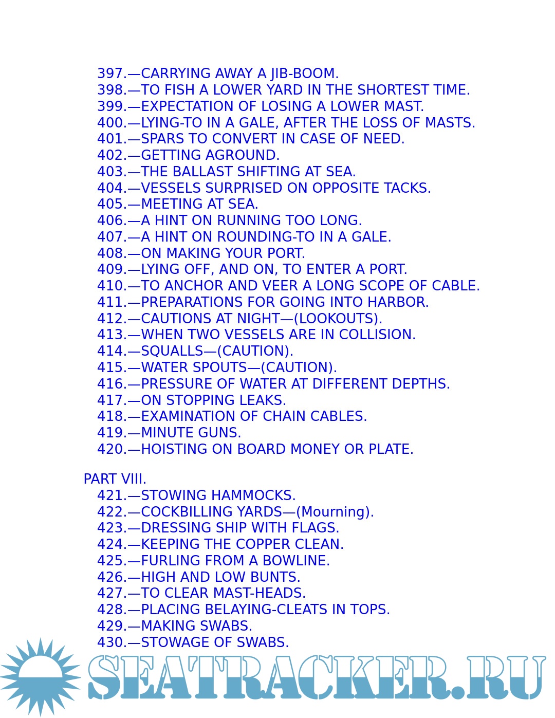 The young sailor learns about stowing provisions, driving before the wind. Securing the ship for sea, and setting and shifting course. He also learns what to do in the extremities of life at sea: how to unbend a topsail in a gate and how to prepare for a hurricane; what to do if the tiller breaks, the mainmast is carried away, or the ship leaks faster than the pumps can free her. Detailed instructions explain procedures for dealing with fires, squalls, and waterspouts, what to do when the main rigging is shot away by an enemy or when a man has fallen overboard, and how to abandon ship and take to the boats when necessary.