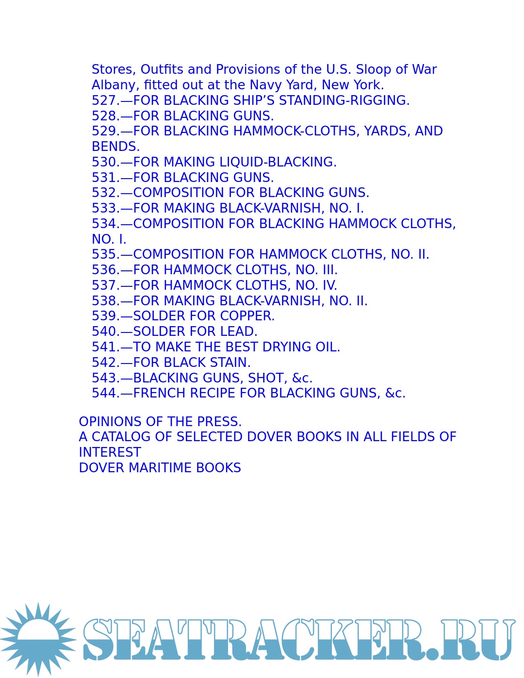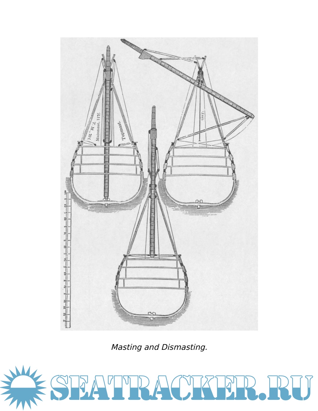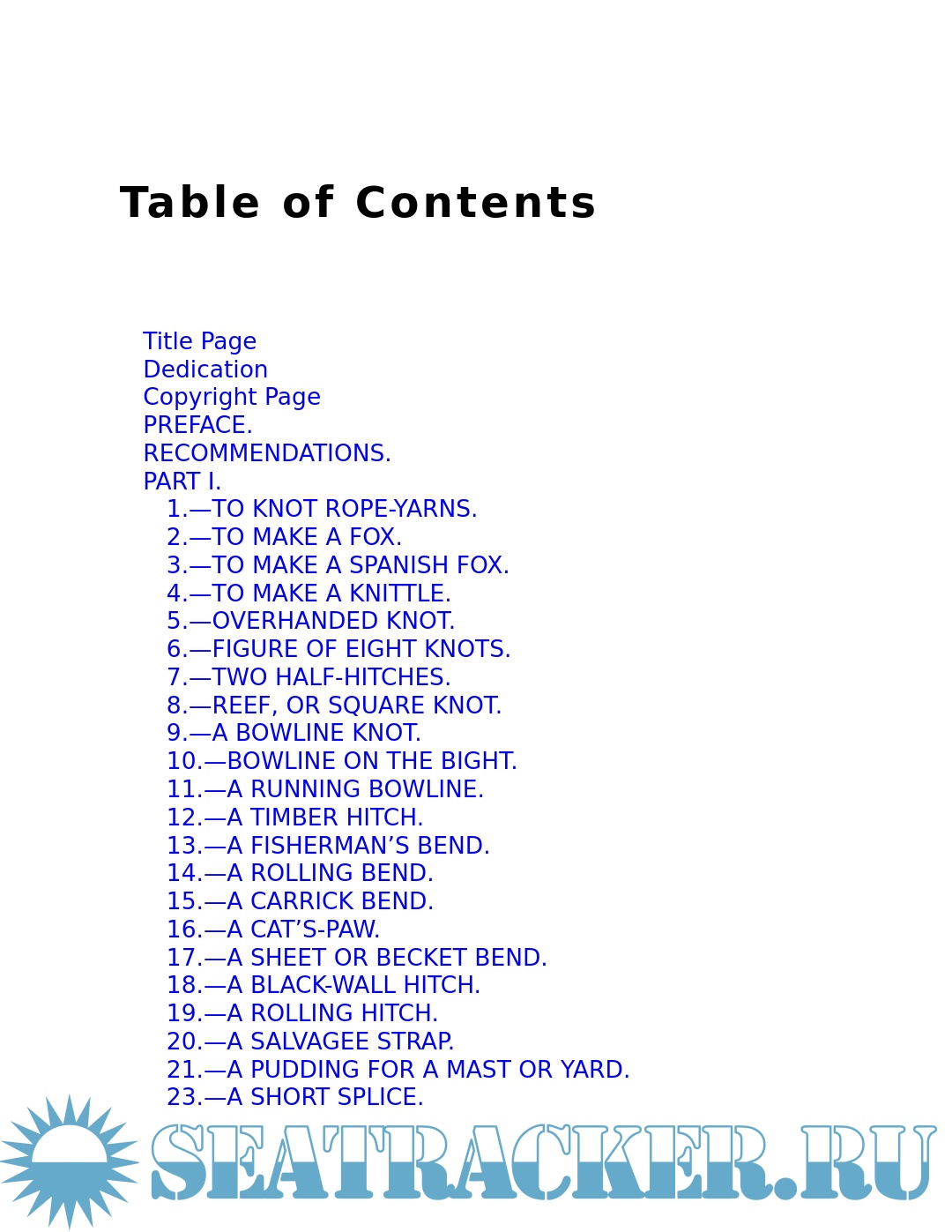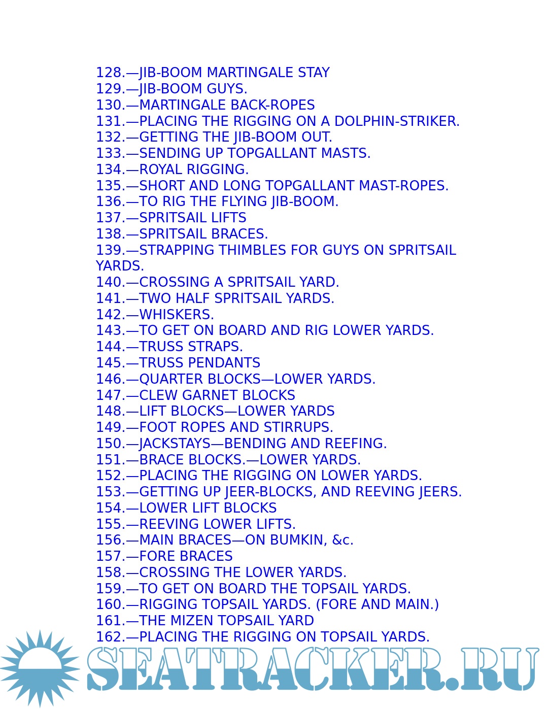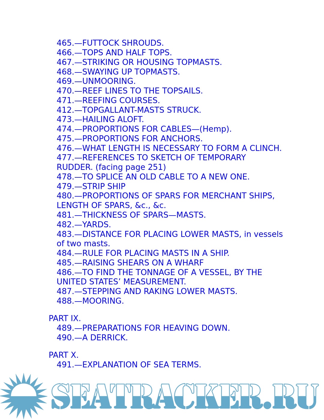 The young sailor learns about stowing provisions, driving before the wind. Securing the ship for sea, and setting and shifting course. He also learns what to do in the extremities of life at sea: how to unbend a topsail in a gate and how to prepare for a hurricane; what to do if the tiller breaks, the mainmast is carried away, or the ship leaks faster than the pumps can free her. Detailed instructions explain procedures for dealing with fires, squalls, and waterspouts, what to do when the main rigging is shot away by an enemy or when a man has fallen overboard, and how to abandon ship and take to the boats when necessary.
