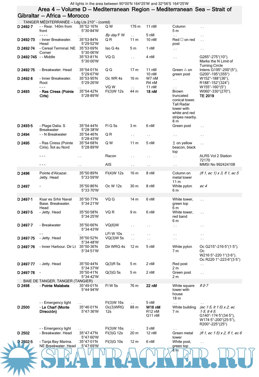 • Details for all lights listed including the international number, location and/or name, geographical position, characteristics and intensity, elevation in metres, range in sea miles and description of structure.