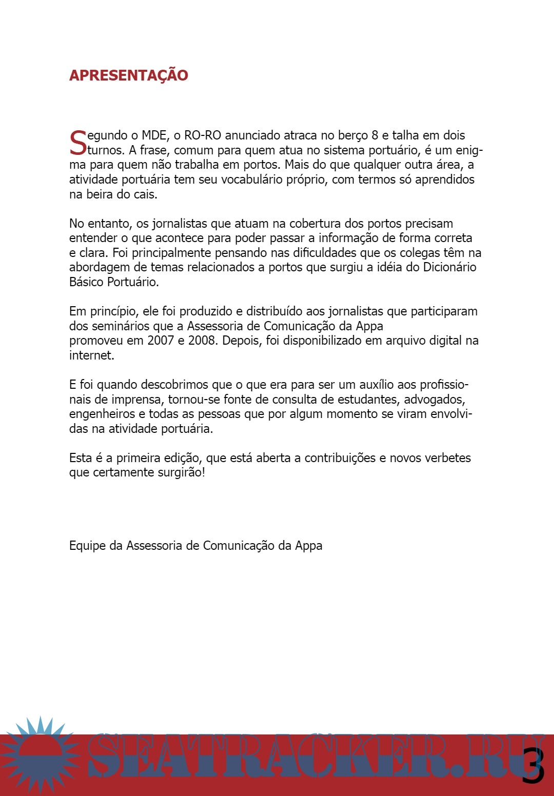 No entanto, os jornalistas que atuam na cobertura dos portos precisam entender o que acontece para poder passar a informação de forma correta e clara. Foi principalmente pensando nas dificuldades que os colegas têm na abordagem de temas relacionados a portos que surgiu a idéia do Dicionário Básico Portuário.