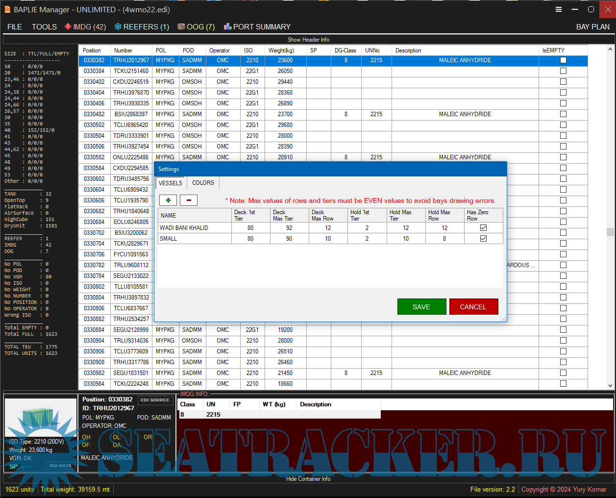 • Size of the Bay Plan could be set in the settings windows providing max values of the rows and tiers of the vessel