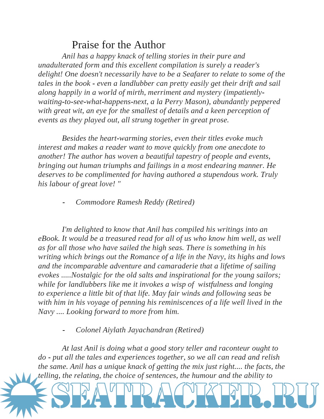 Description: This book is a collection of fictional anecdotes referring to my time spent at the National Defence Academy, the Indian Navy and post retirement from the Navy.