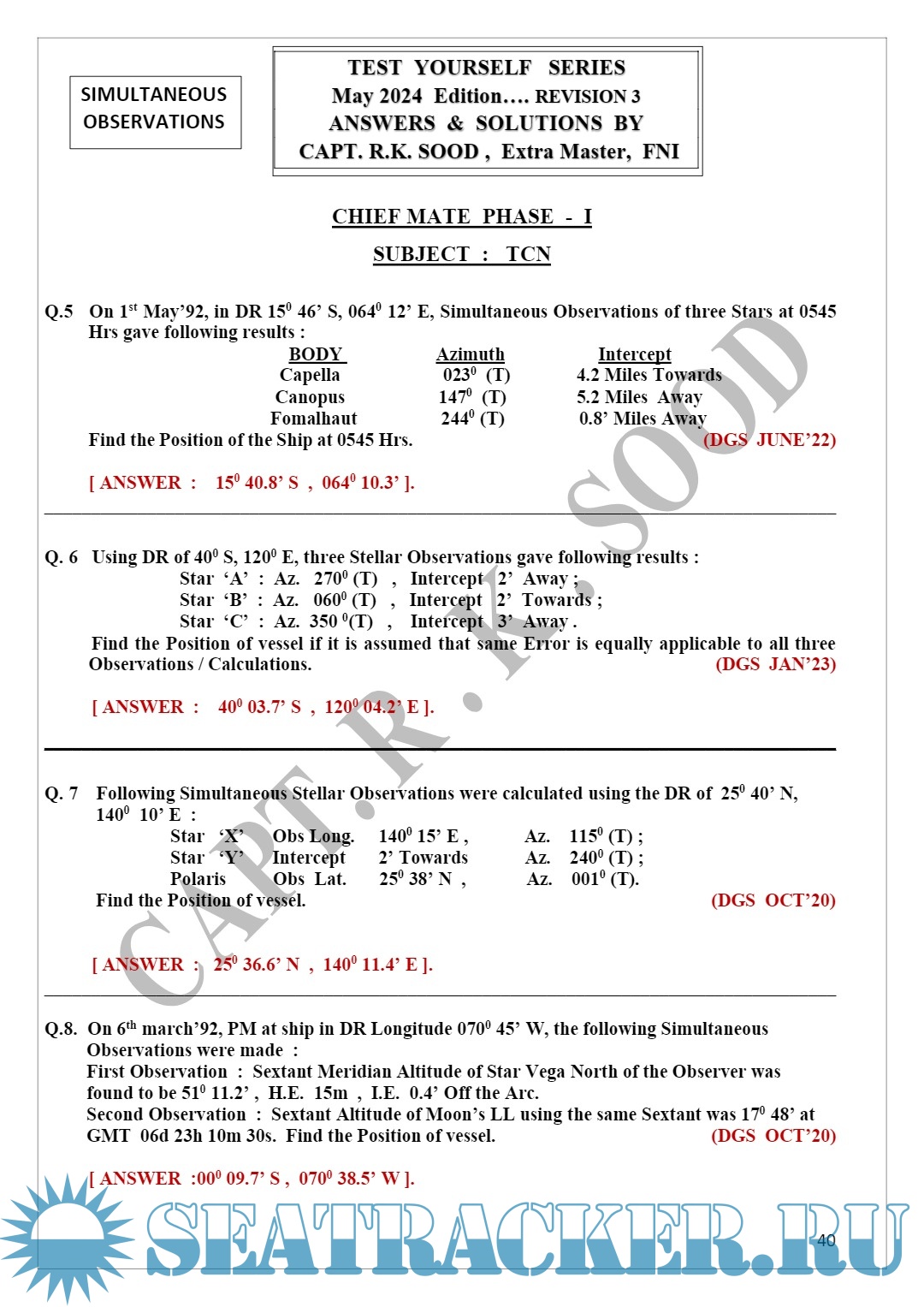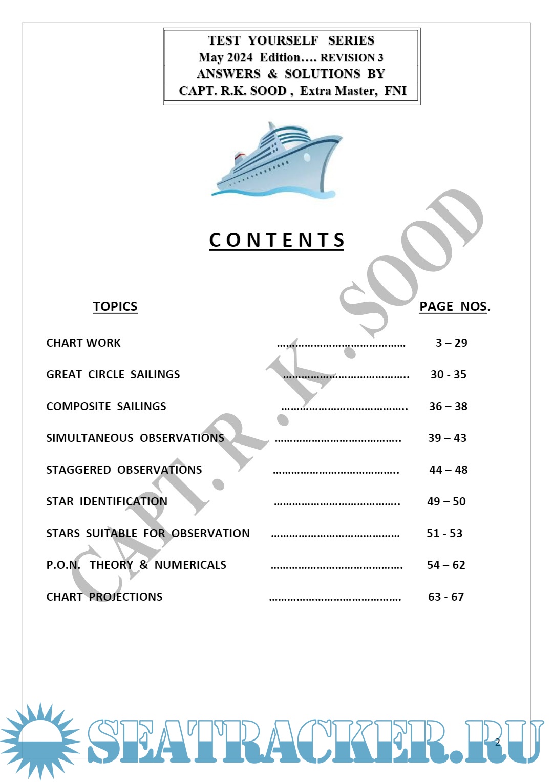Year: 2024 Language: English Author: Capt. R.K. Sood Edition: Revision 3 | May Format: PDF Quality: eBook Pages count: 68 Description: From the author: As a starter, under ‘TEST YOURSELF SERIES’ , I have tried to venture in to the field of ‘TERRESTRIAL & CELESTIAL NAVIGATION’ (TCN) Subject of Chief Mate (F.G.) Level, notoriously considered by some to be the ‘Most Difficult Paper to Crack’ among all Subjects from Master (F.G.) down to Second Mate (F.G.) levels ! Variety of Questions, covering virtually all topics of the Subject, which have appeared in the Past DGS Examinations Papers and some my own, have been solved and ANSWERS given, so that you can check your own Competence in the subject of NAVIGATION. Please disregard the previous three editions of the same Series. A Word-of-Caution : Since I have solved CHARTWORK Questions on the Original Charts, your own Answers may differ somewhat from my own, particularly if you solve these Questions on the Photostatted Copies of Charts ! In spite of Corrections/Amendments made through three previous editions, should you still find any errors in my answers, kindly let me know. I will surely make changes after re-checking of the same. Wishing you all success in your Competency Examinations & have Safe Sailings. Additional info: About the Author: This small ‘Effort’ of mine, for the benefit of Mariners & at NO-COST to them, is dedicated to my Guruji Capt. S.S.S. Rewari, an epitome of Maritime Education & Training in India, and under whose Guidance & Encouragement, I reached this humble level of teaching the intricacies of CELESTIAL, Terrestrial & Oceanic NAVIGATION Subject, to our budding Navigators in the Merchant Navy. I have been teaching these & other Subjects to Marine Officers, in D.G.S. Approved Post-Sea Maritime Training Institutes, for the past 30 years, from the levels of second-Mates up to MASTER (Foreign Going) & beyond levels, right up to Revalidation Courses, when Officers are preparing for their COMPETENCY Examinations held by the Directorate General of Shipping, GOI and for Updating their Licenses. Earlier, I had sailed for 23 years (14 years as Master) on Foreign Going ships under the Management of ANGLO EASTERN , UNIVAN & WALLEM.