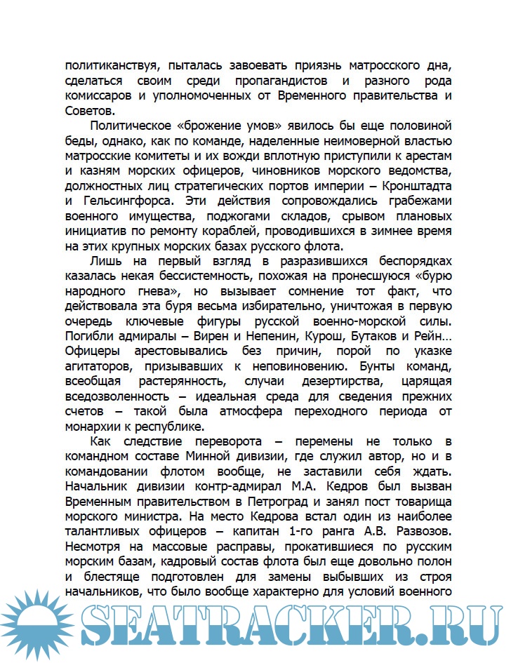 III Судовые комитеты. "Центробалт". Натравливание команд на офицеров. Снятие погон. Уничтожение званий кондукторов и сверхсрочнослужащих. Переименование кораблей. Образование союзов. Делегация офицеров у Керенского. Смещение Максимова и назначение контр-адмирала Д.Н. Вердеревского. Его конфликт с Временным правительством. Назначение А.В. Развозова. Корнилов-ское выступление. Убийство четырех офицеров "Петропавловска". Взгляд Керенского на это злодеяние. "Углублениереволюции" на флоте. Выборы в Учредительное собрание. Большевистский переворот. Гибель "Гепарда" и "Бдительного". "Морская коллегия". Модест Иванов. Упразднение должности командующего флотом. Уход Развозова, Бахирева, Беренса и других офицеров. Декрет о "красном флоте". Беспокойство команд в связи со слухами о германском десанте. Избрание вице-адмирала Развозова и его арест. Германская эскадра в Гангэ. Уничтожение "АГ-11", "АГ-12", "АГ-15", "АГ-16", "Оланда" и "Ястреба". Ультиматум об уходе из Гельсингфорса. Уничтожение английских подлодок. Переход флота в Кронштадт. Суд и казнь A.M. Щастного