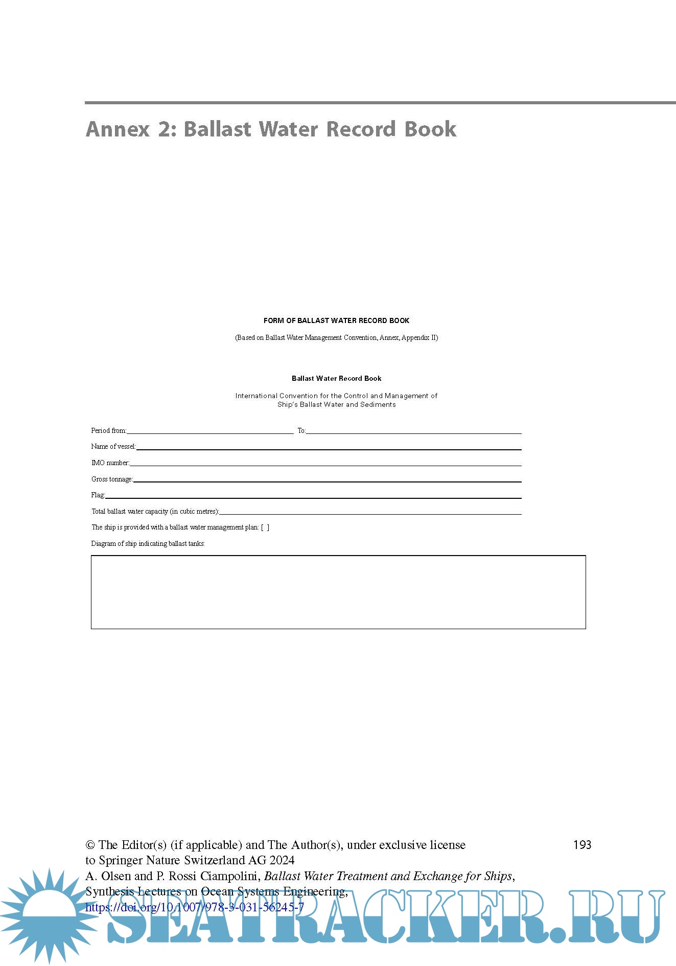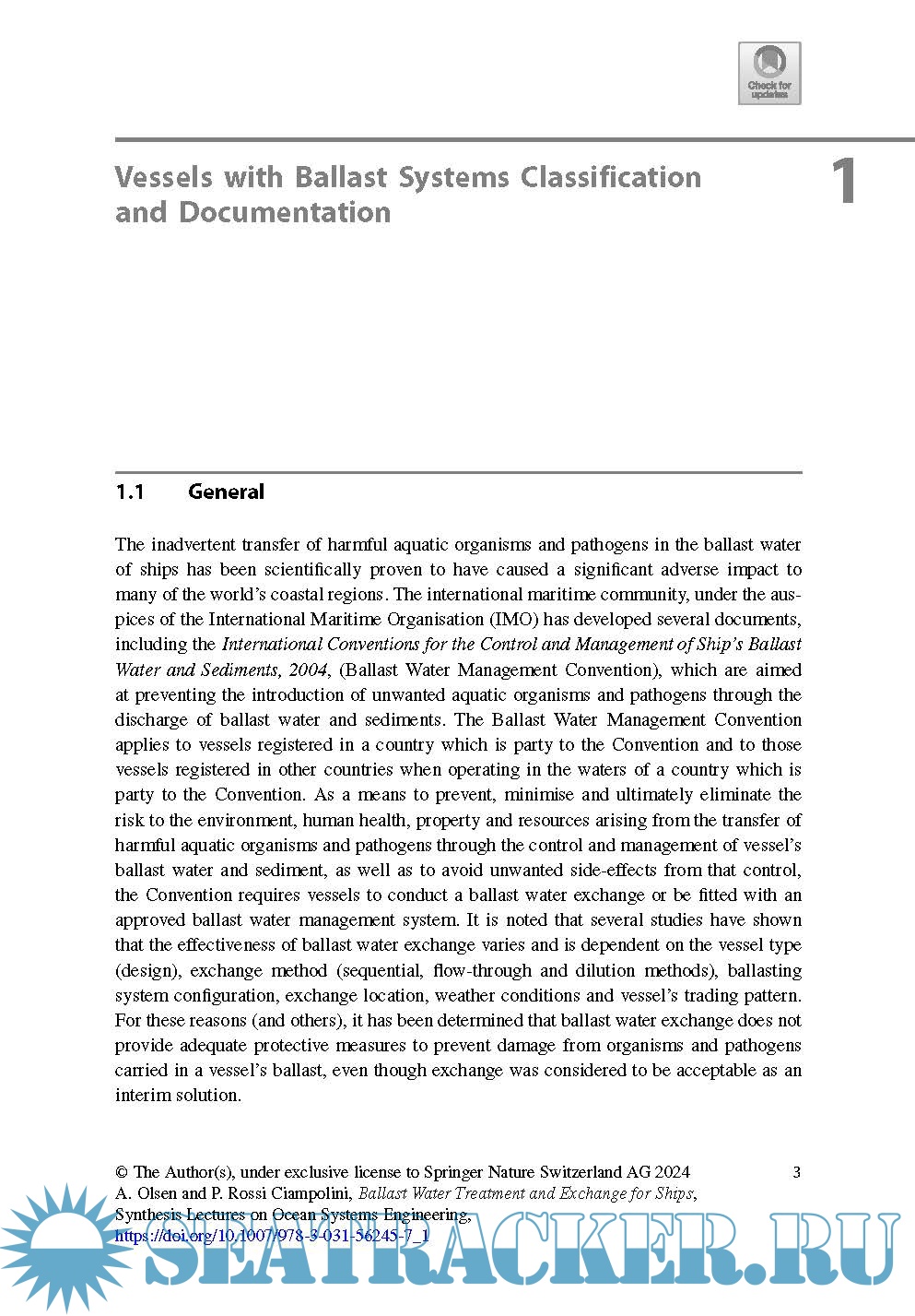 Year: 2024 Language: English Author: Alexander Olsen, Pamela Ciampolini Genre: Other Publisher: Springer Edition: 2024th edition (May 2024) ISBN: 9783031562457 Format: PDF/EPUB Quality: eBook Pages count: 212 (.pdf length) Description: The inadvertent transfer of harmful aquatic organisms and pathogens in the ballast water of ships has been determined to have caused a significant adverse impact to many of the world's coastal regions. The international maritime community, under the auspices of the IMO has developed several documents, including the “International Conventions for the Control and Management of Ship's Ballast Water and Sediments, 2004”, (Ballast Water Management Convention), which are aimed at preventing the introduction of unwanted aquatic organisms and pathogens through the discharge of ballast water and sediments. The Ballast Water Management Convention applies to vessels registered in a country which is party to the Convention and to those vessels registered in other countries when operating in the waters of a country which is party to the Convention. It has been determined that ballast water exchange does not provide adequate protective measures to prevent damage from organisms and pathogens carried in a vessel's ballast, even though exchange was considered to be acceptable as an interim solution. This book includes updates for the clarification of Survey requirements and adds the definition of biological commissioning, testing as well as requirements for Class approved Service Providers to conduct biological commissioning testing. Moreover, this book includes updates due to the adoption of the requirements from IACS UR M74, Rev. 2 and UR F45 and is applicable for existing ships, where an application for approval for the plans of BWMS is made on or after 1 July 2022; or for new ships contracted for construction on or after 1 July 2022.