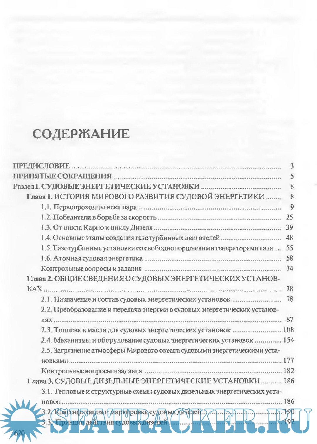 Освещены история становления и развития судовой энергетики, её современное состояние и достижения. Рассмотрены вопросы компонирования, общей структуры и показатели всех типов судовых энергетических установок (СЭУ), классификация, структура и характеристики современных судов, на которых применяются СЭУ. Внимание уделено судовым дизельным, паро- и газотурбинным энергетическим установкам.