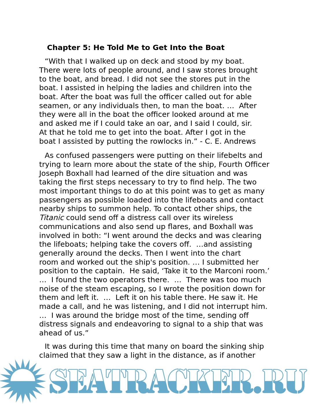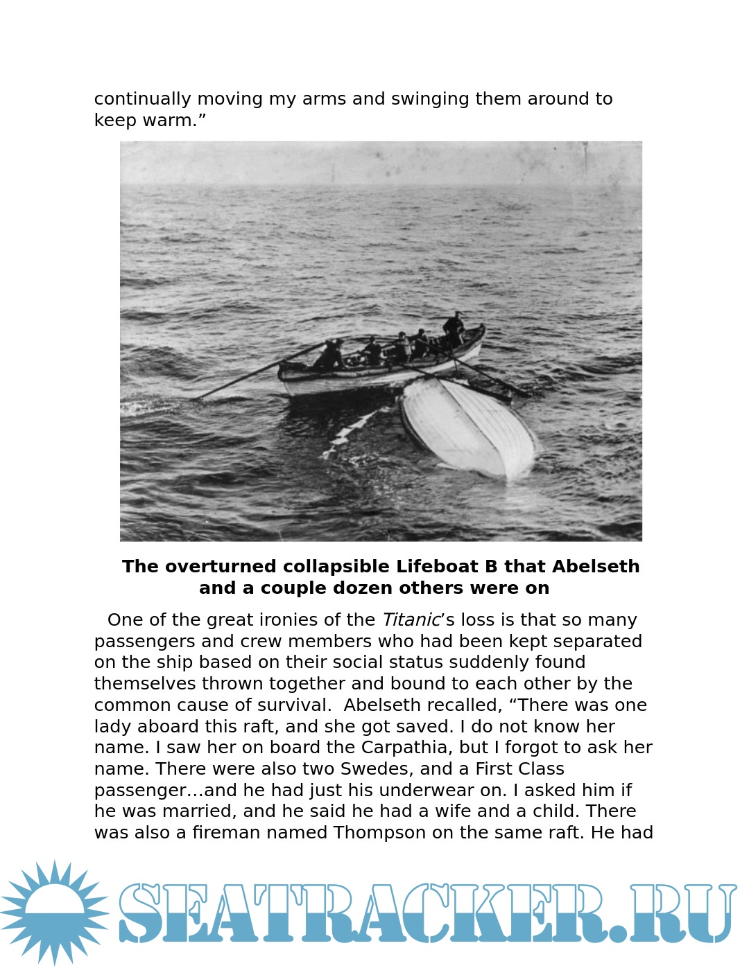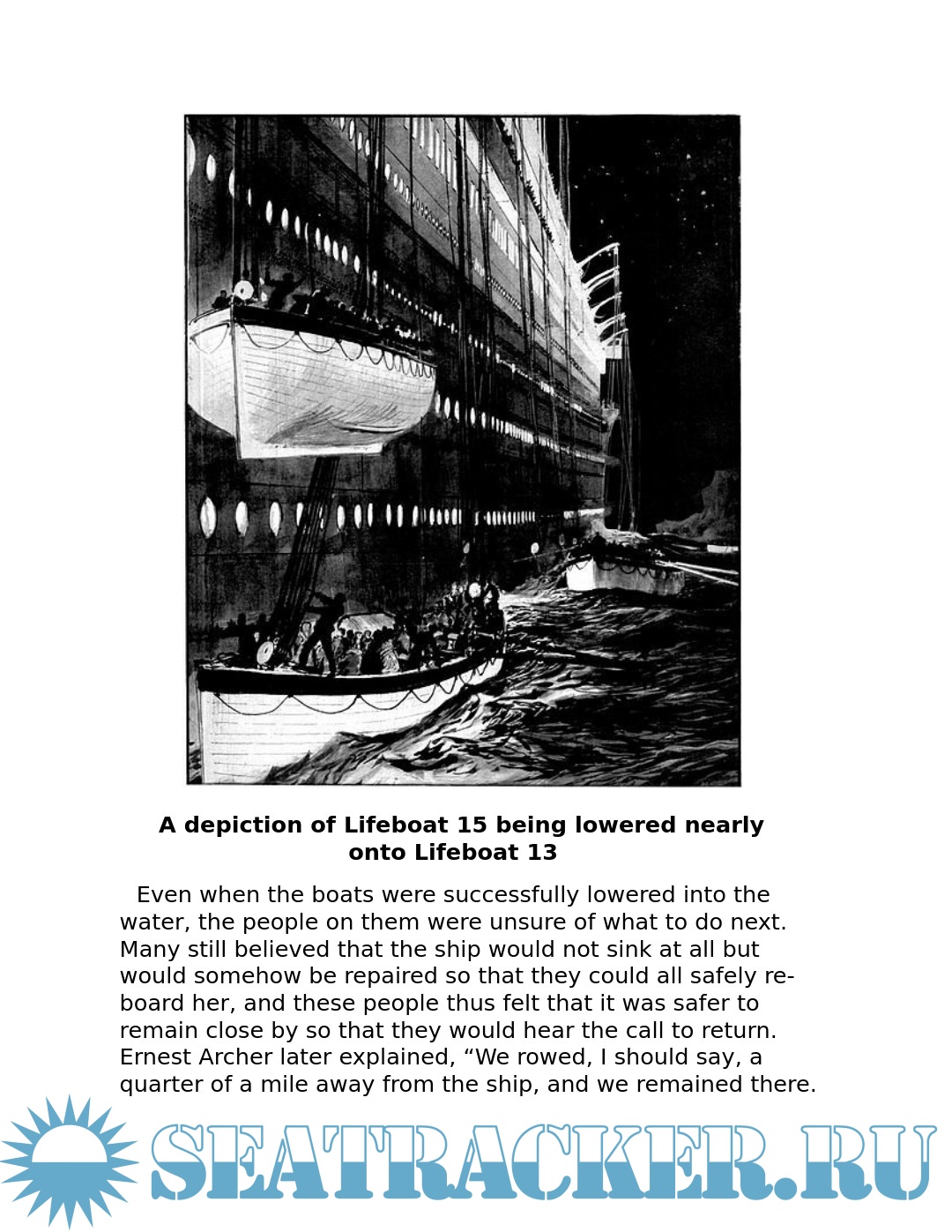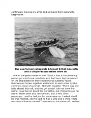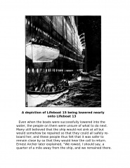 “Barrels and chairs were being thrown overboard. Then suddenly, when we still seemed very near, we saw the ship was sinking rapidly. I was in the bow of the boat with my daughter and turned to see the great ship take a plunge toward the bow, the two forward funnels seemed to lean and then she seemed to break in half as if cut with a knife, and as the bow went under the lights went out; the stern stood up for several minutes, black against the stars, and then that, too, plunged down, and there was no sound for what seemed like hours, and then began the cries for help of people drowning all around us, which seemed to go on forever." - Emily Ryerson